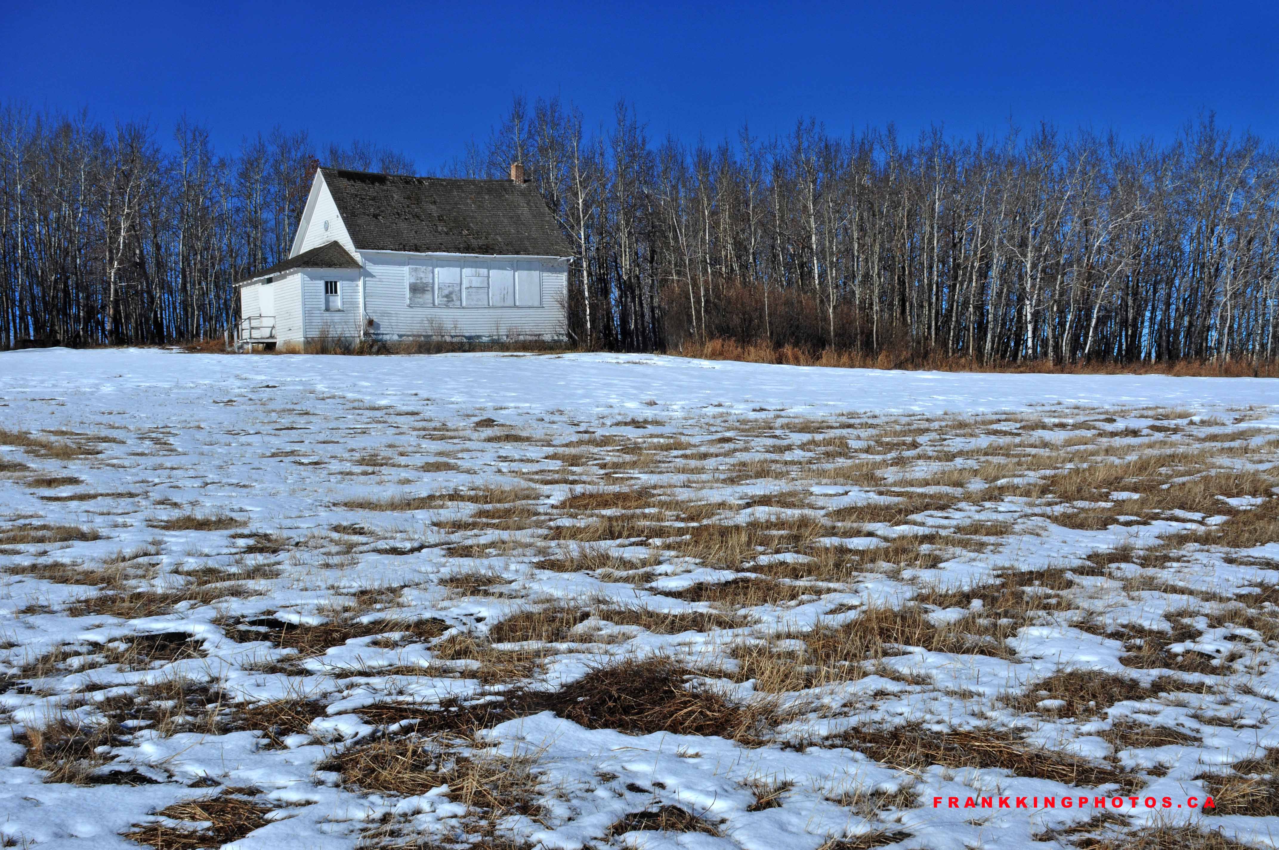 The mottled pattern of late-winter snow caused me to go for a wide-angle perspective on this heritage school, north of Calgary, Alberta near the town of Carstairs. The strong horizontal lines of trees and sky also made the scene worth photographing. Nikon D90, tripod, polarizing filter.