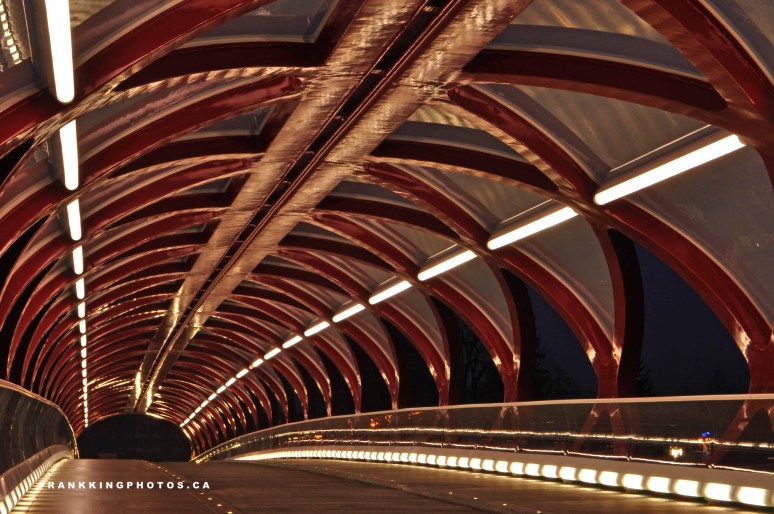 Calgary’s newest architectural marvel opened yesterday, after many controversial and expensive delays, and I went there before sunrise today to make photographs. It turned out to be every bit as spectacular a subject as I hoped for; I spent almost an hour “working” the pedestrian/cyclist bridge (which spans the Bow River) from both ends and in the middle, going with a variety of wide-angle and telephoto views, plus trying some long exposure zooming in-and-outs. Almost everything I tried turned out brilliant – a credit more to architect Santiago Calatrava than my skills. (I photographed one of his other Canadian creations, Brookfield Place in Toronto. That photo is also on this website.) Nikon D90, 18-55 mm. lens, tripod.