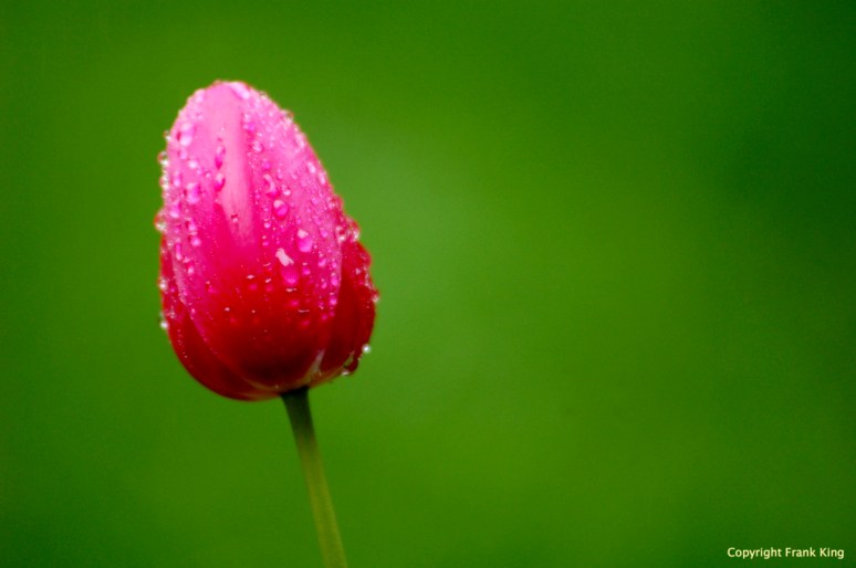 One morning, I came outside after an overnight rain, saw the tulip covered in drops and knew the moment arrived. Went back inside, hauled out my old Nikon D50 (since replaced by a D7100) & tripod and used an 80-200 mm. zoom lens (also retired) at the most wide-open F-stop in order to keep the background thoroughly out of focus.