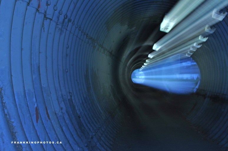 While seeking landscape compositions of the Thompson River, I stumbled upon this illuminated walkway pipe under the Trans Canada Highway. The tight confines and strong circular lines intrigued me, so I went to work with my Nikon D90, tripod and 18-55 mm. zoom lens. Experimented with all kinds of light balances, with and without a flash (this photo is likely with a flash) and did some long-exposure zoom pictures like this. Ended up with lots of interesting photographs of a very unlikely subject.