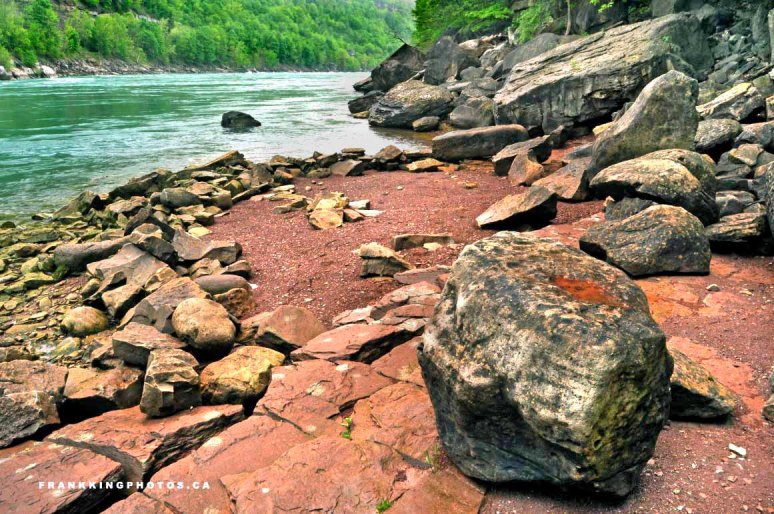 I hiked to the bottom of the gorge, several kilometres from Niagara Falls, and found this wonderful red rock to work with along the river shore. The other side of the river is the United States. Nikon D90, tripod, polarizing filter and a soft-edge, graduated density filter to darken the upper left section of the picture.