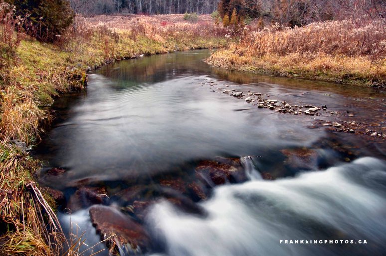 Many landscape photographers feel a bit of a let-down after the glory of autumn’s florescent colours ends and we’re left with a dead landscape until winter arrives. I’m certainly one of them, but on this day I went out anyway, looking for images in a part of this wonderful conservation area (east of Toronto, Canada’s largest city) that I rarely visit. I found this nice curve in the stream, but had to work hard to keep the bland, distracting grey sky out of the scene. Nikon FM2, Velvia slide film, tripod, polarizing filter.