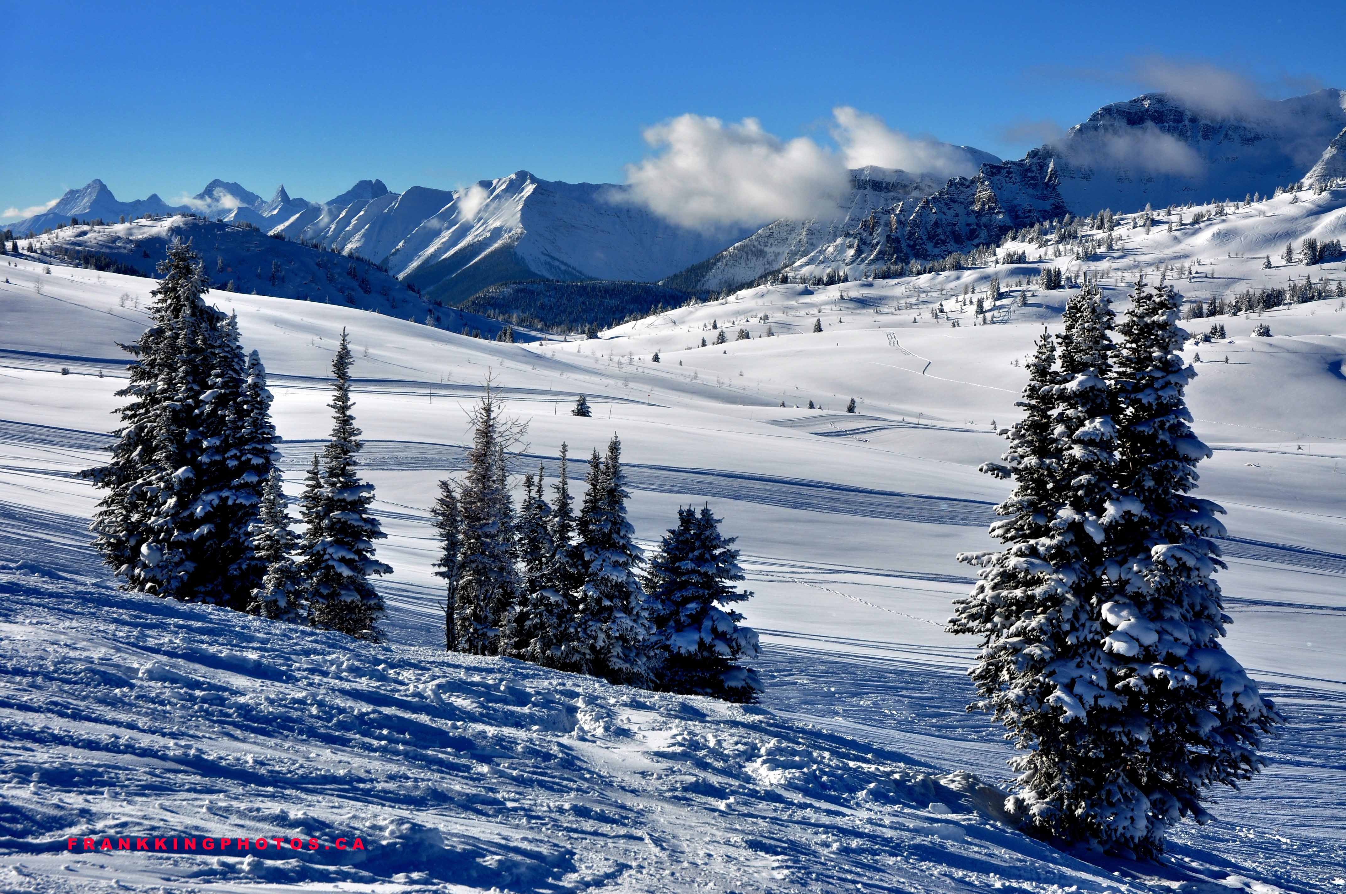 During a recent ski trip to this renowned resort in the Canadian Rocky Mountains, I took my Nikon D90 and 18-70 mm. lens along for a few runs and hand-held for photos like this. Conditions were incredible, so almost everything I photographed came out useable. This is more of a wide-angle perspective, so the peaks don’t loom as impressively. But I wanted at least a few photographs to have a strong foreground subject and I think this scene qualifies.