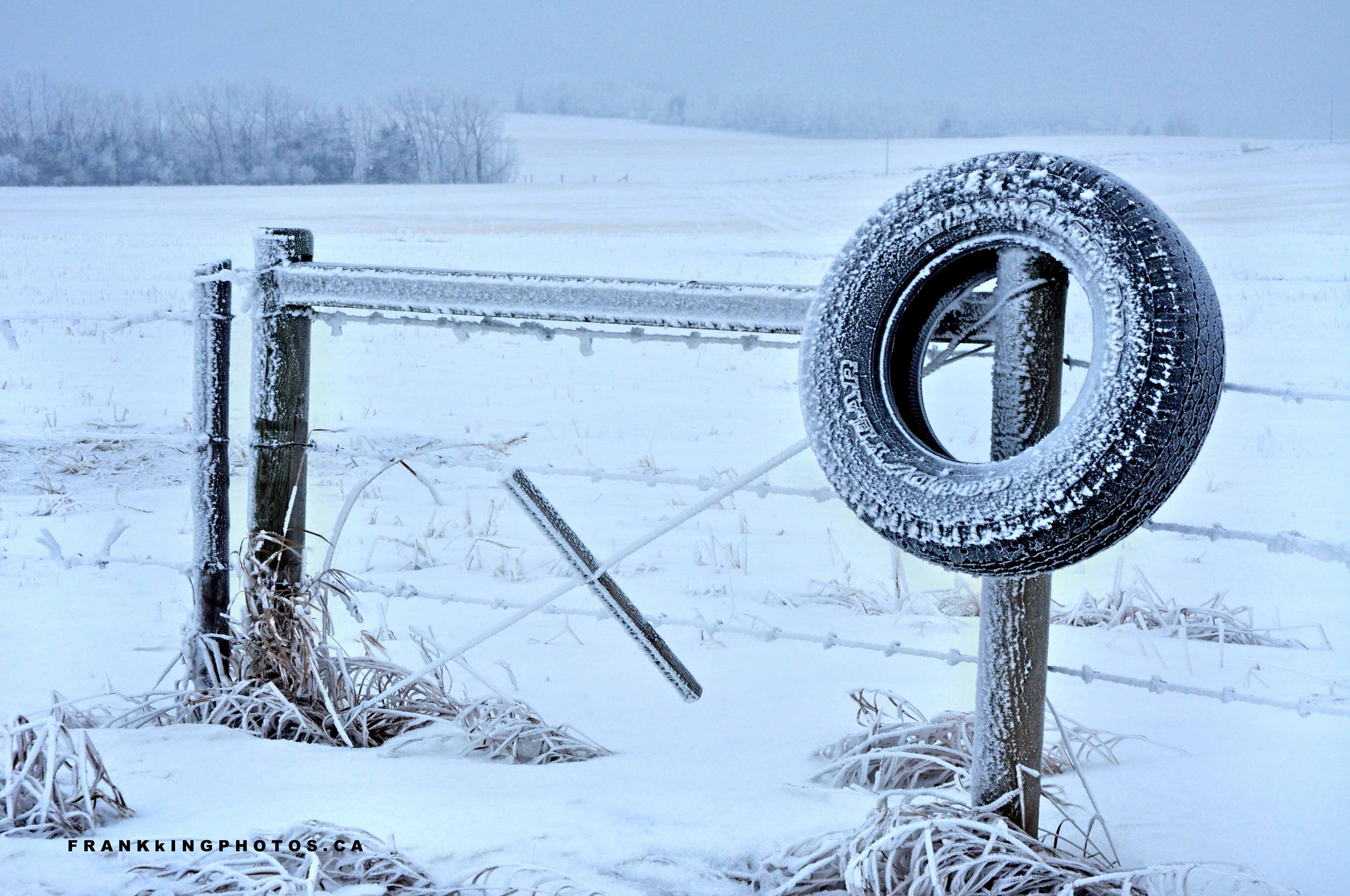 It wasn’t *that* cold, but never mind the temperature. The biting prairie wind made it seem absolutely frigid. I loved this section of countryside just north of my home in western Canada, but after 15 minutes’ outside the car, I was done. Fortunately, that brief time was enough to make this satisfying photo and more. One of my biggest challenges here (besides the cold) was getting a high enough viewpoint to put the tire below the horizon.