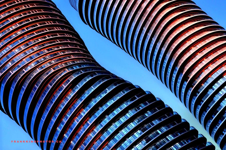 These two condominium buildings, in this city on the western edge of Toronto, are the tallest and most spectacular of the five structures in the Absolute World project. These award-winning designs, completed in 2012, are 50 and 40 storeys tall. They were designed by Chinese architect Yansong Ma, who won an international design competition. They’ve been nicknamed the ‘Marylin Monroe’ towers, for obvious reasons. And those same reasons are what drew me to photograph them at sunrise during a recent Toronto trip.