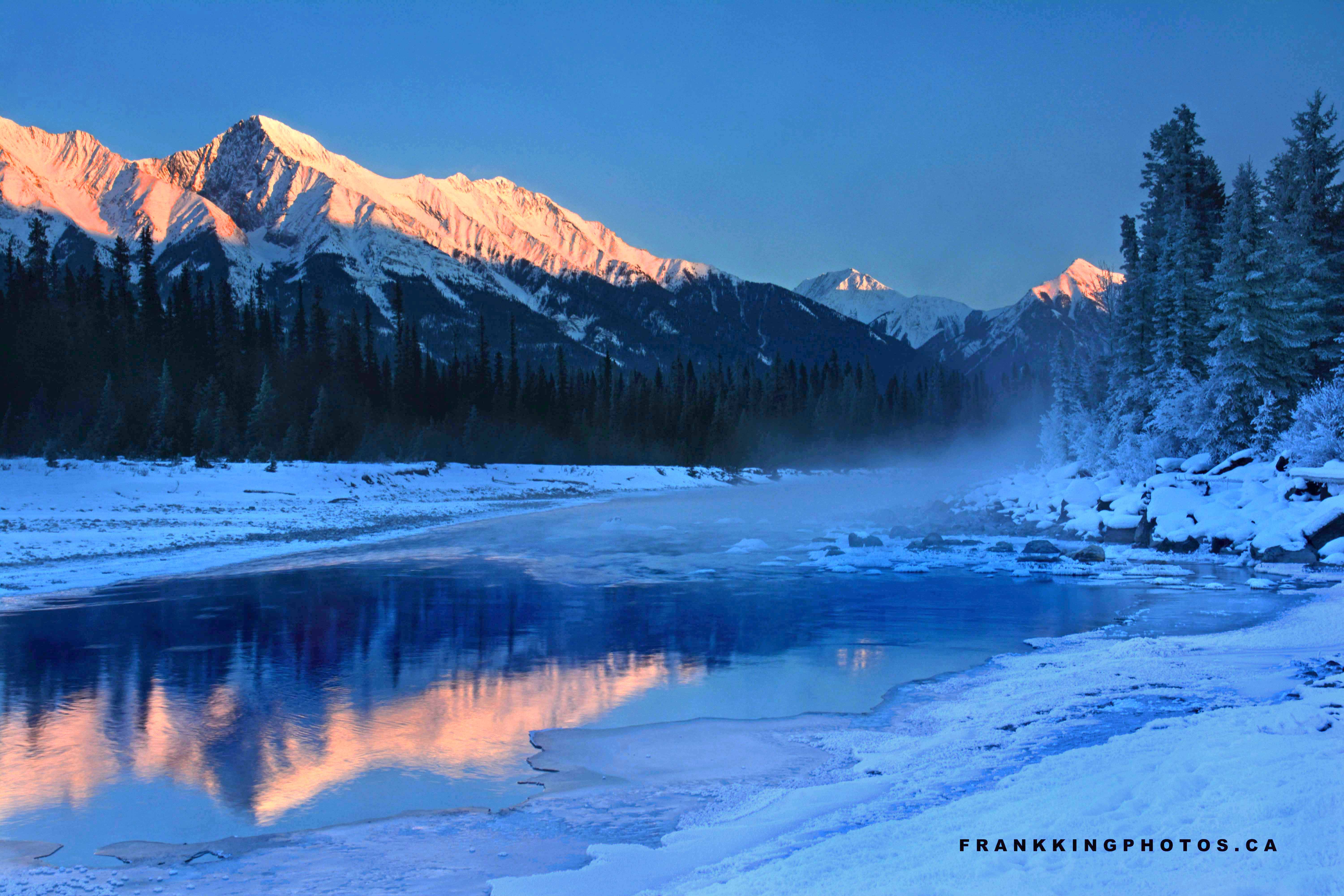 Yes, it was cold. Quite cold. But not so cold that, when I saw this stunning reflection in a quiet section of the Kootenay River, I couldn’t be persuaded to stop. A few minutes of careful walking on the snow brought me to the water’s edge, where I could set up the tripod in peace and fiddle around with a graduated density (darkening) filter on the top half of the scene until I had the picture I wanted. Pretty amazing, eh?  🙂