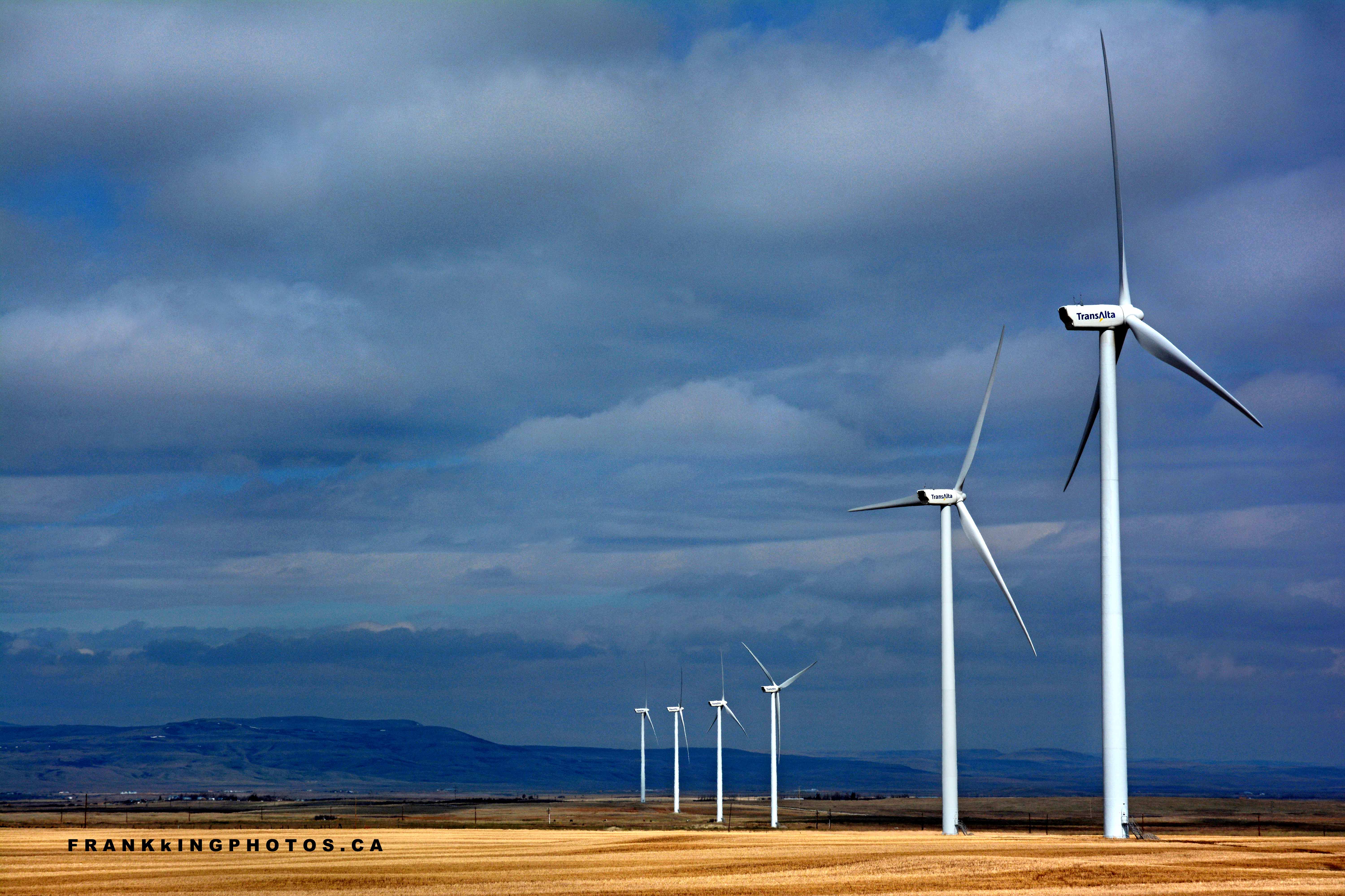 The glorious prairie landscapes around Pincher Creek are dotted with hundreds of wind turbines. This is a blustery area, with strong chinook winds often blowing east off the nearby Canadian Rocky Mountains. I like how the morning sun made the field glow against the dark sky and distant peaks.