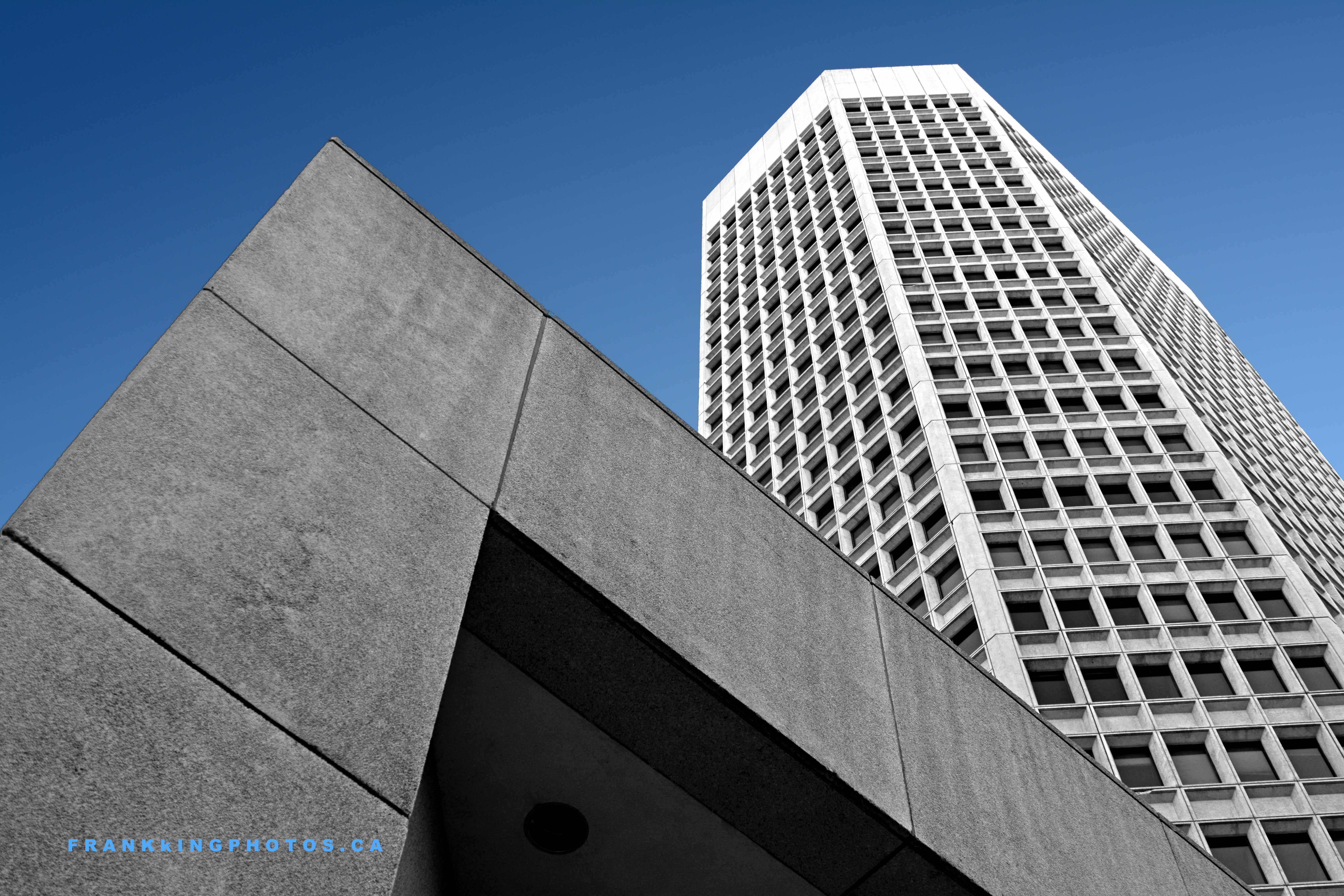 The 31-storey, 410-foot Encana Place was completed in 1982. Until a few weeks ago, nothing about the building truly grabbed my attention. Then I started walking around the front plaza and found this dramatic angle of lobby juxtaposed against the tower. So I found a spot where it sticks into the sky almost as much as the tower and made this picture. During processing, I converted the building to black & white and liked the effect. Nikon D7100, tripod, polarizing filter.