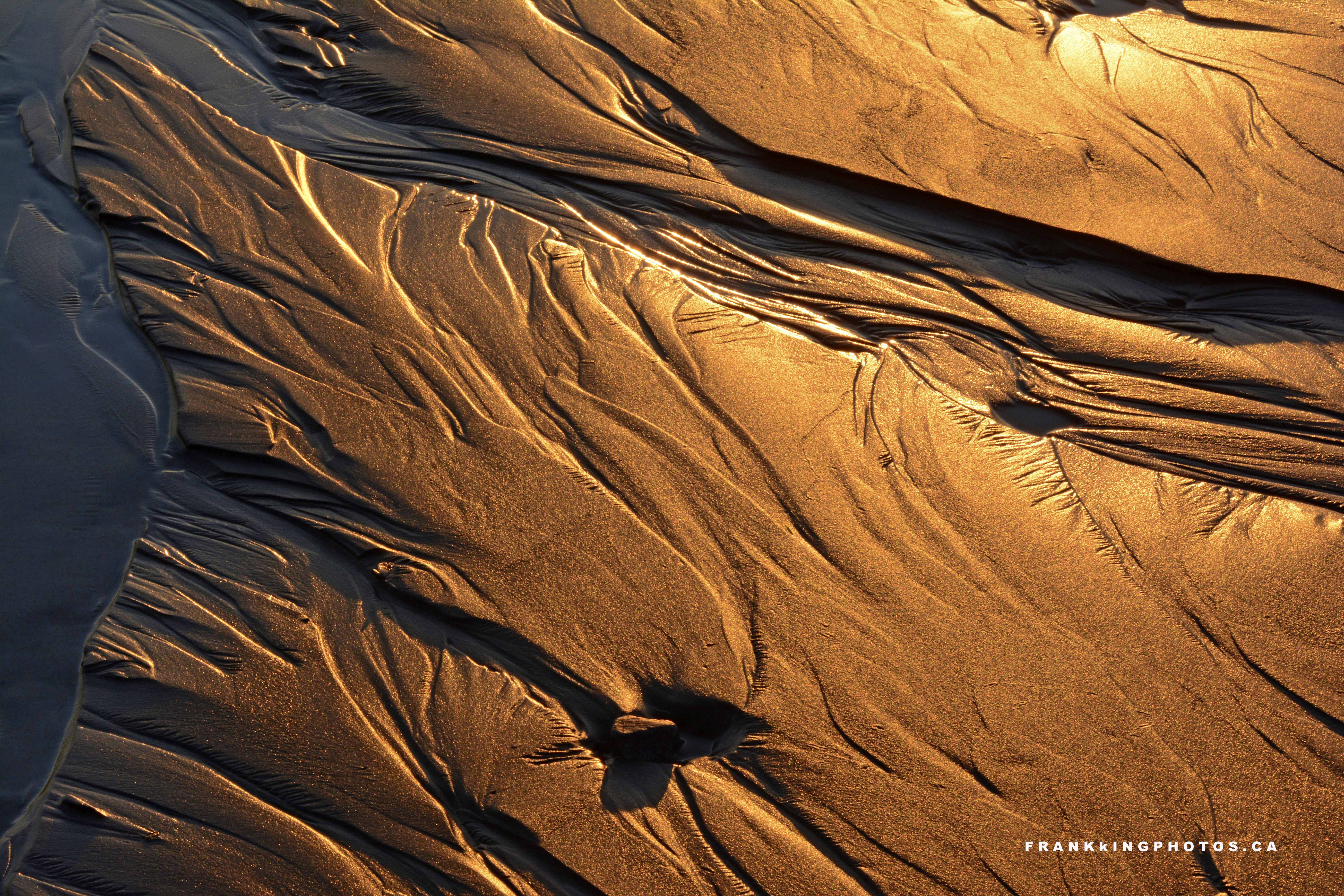 I love photographing natural abstract patterns. So when I saw how the evening light was catching the pattern made by water flowing through the beach to the Pacific Ocean on the west coast of Vancouver Island, I immediately went to work to capture it.
