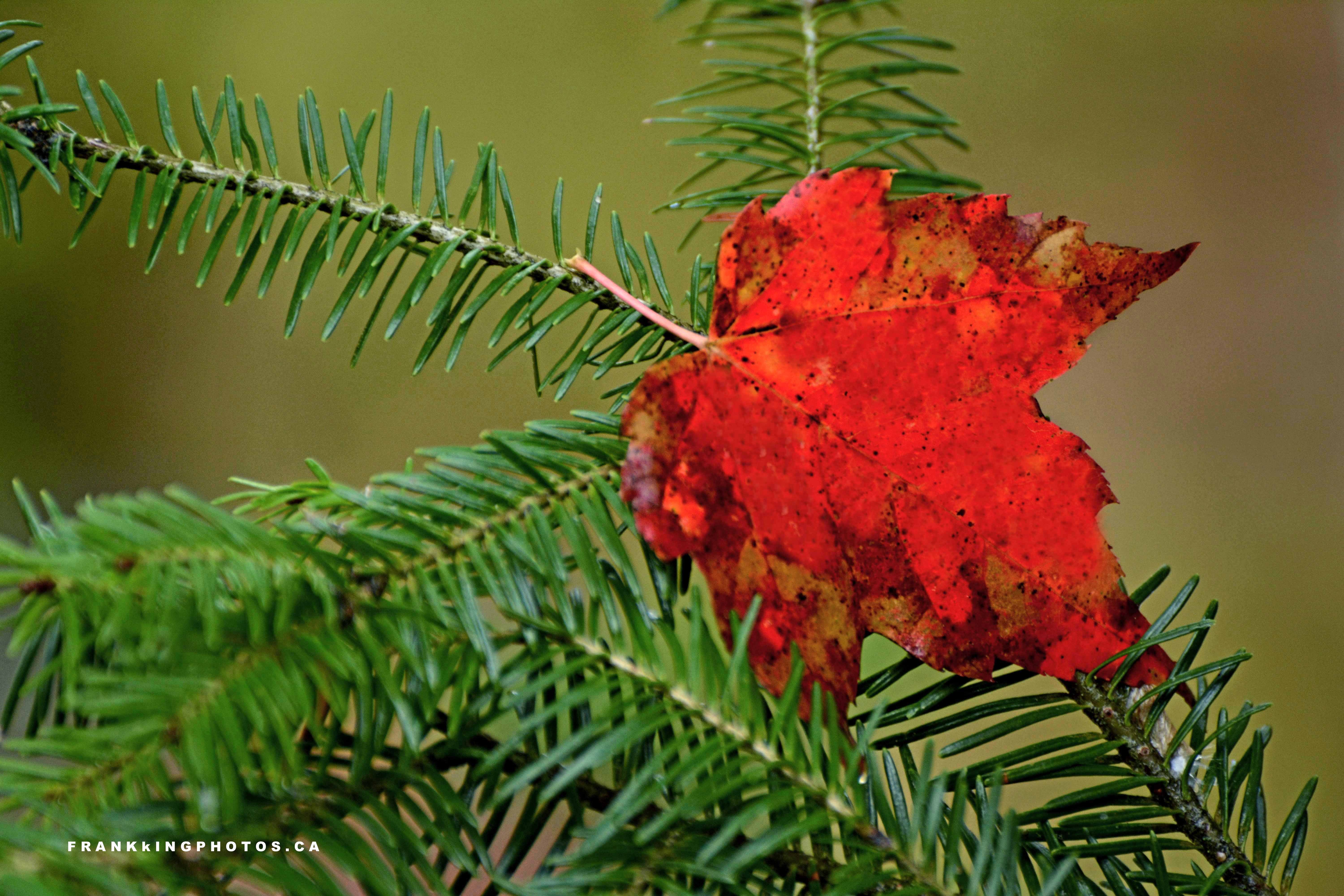 AUTUMN LEAF AND CONIFER, DEEP RIVER, ONTARIO, CANADA