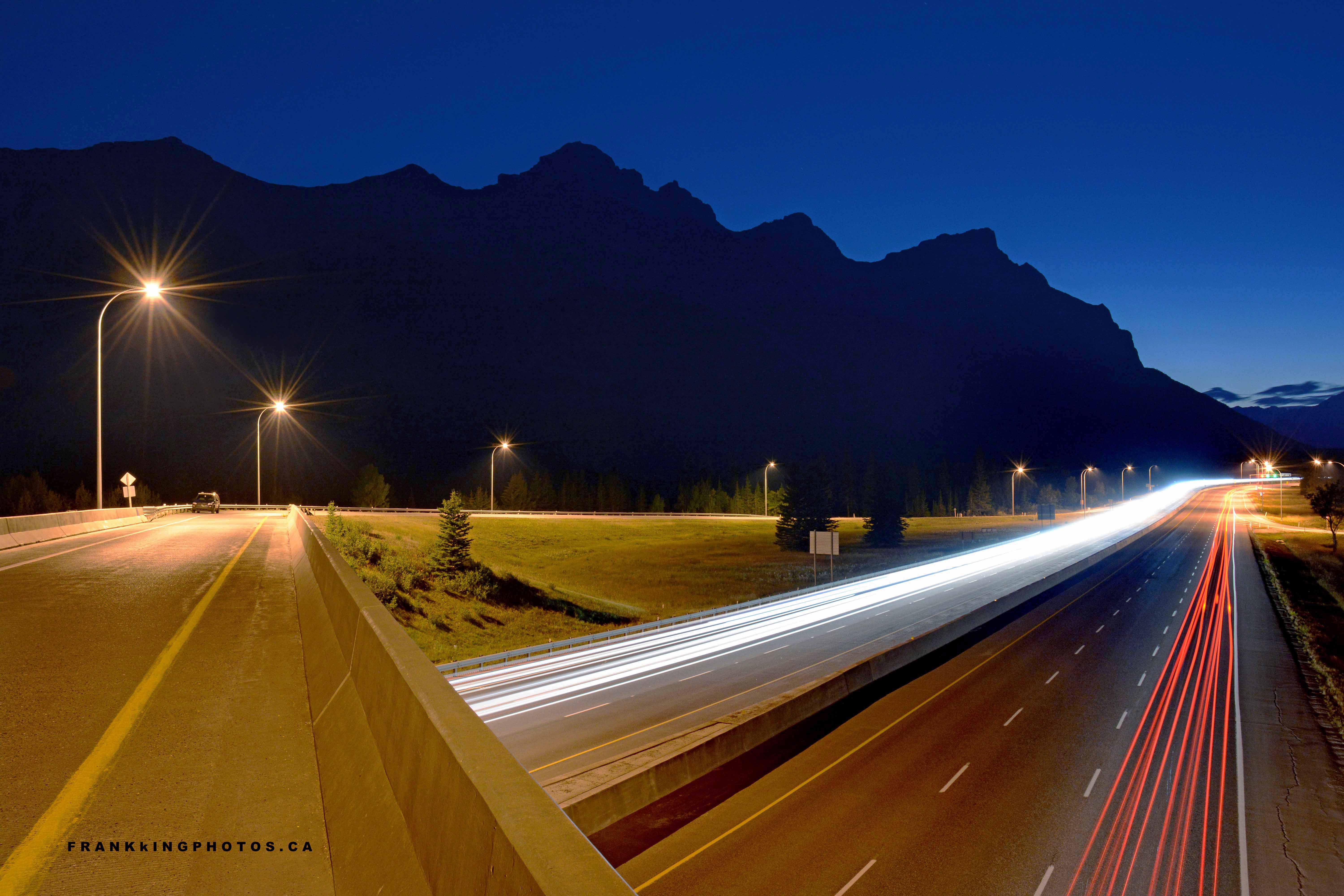 An overpass over the Trans Canada Highway, just before the road goes into Banff National Park, was an ideal spot to photograph traffic after sunset. I made a lot of exposures from this spot, each time trying to capture the ideal balance of traffic going each way. (That’s my minivan parked off in the distance.)