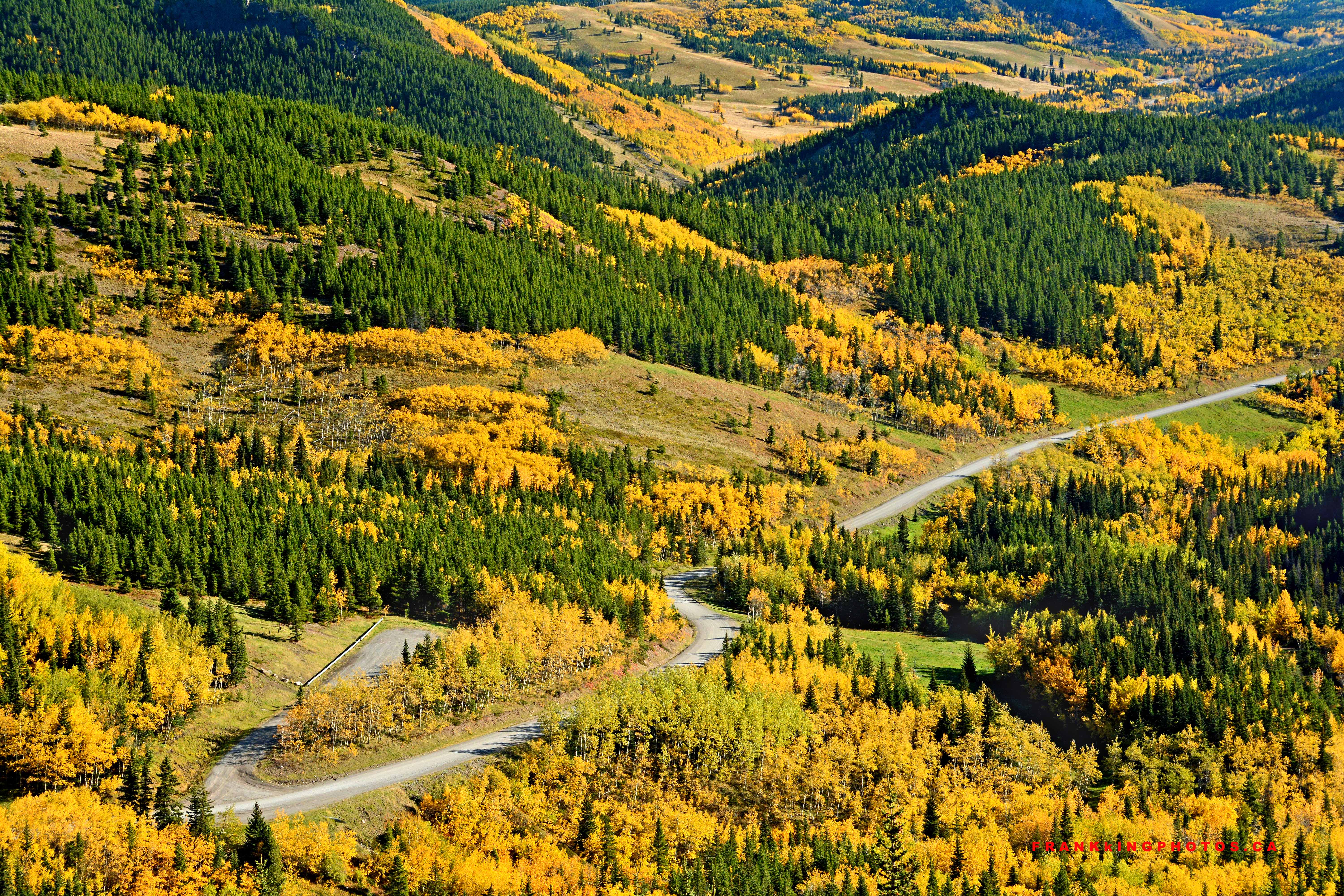 1. Are these Aspens or Larches that create this fantastic yellow panorama? This is a wonderful overview, especially helped by the diagonal track of the road. Great shot, Frank.