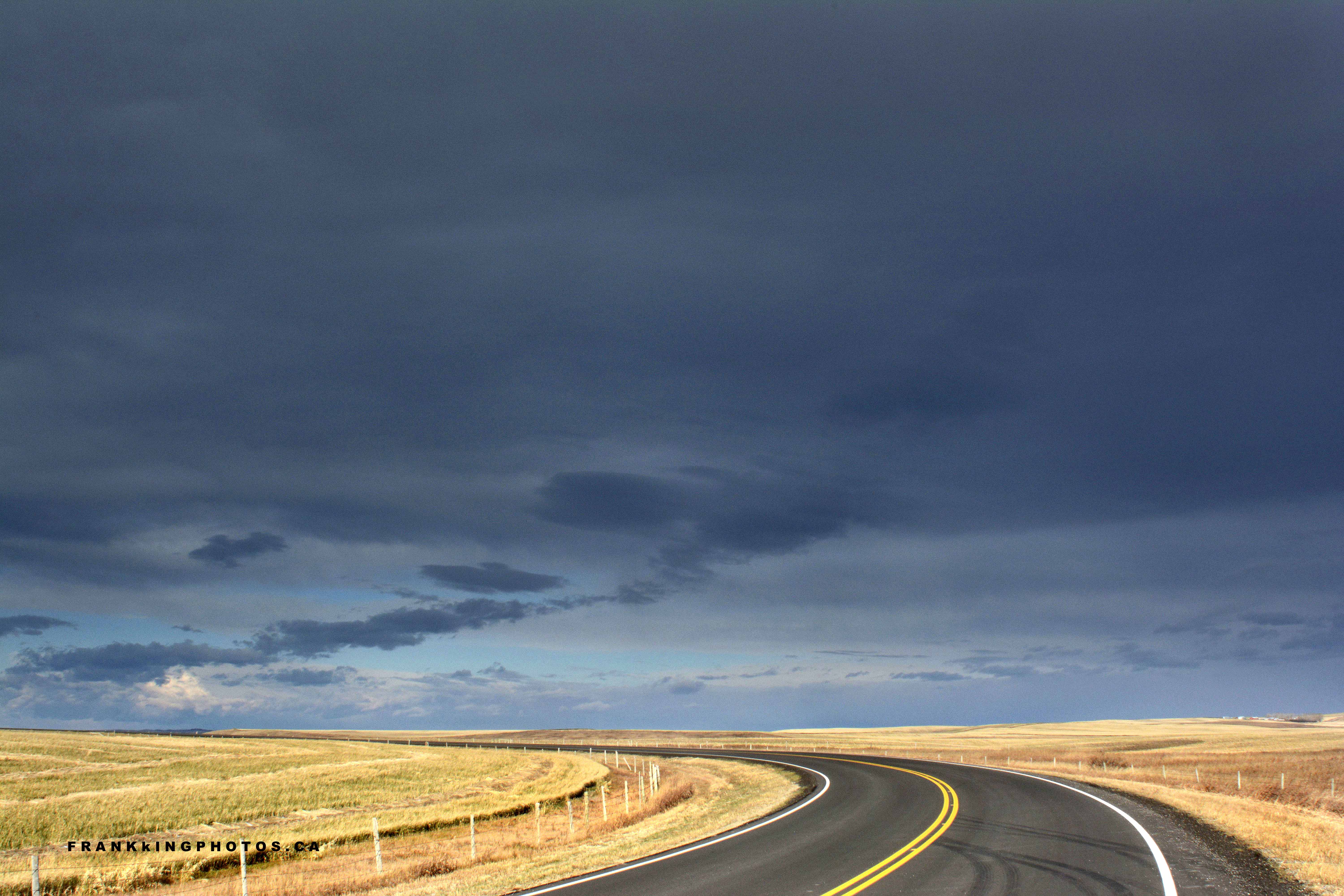 The empty landscape and the curving lines of the road have grabbed my attention every time I’ve driven this route, just 15 minutes’ drive from my home in this western Canadian city. When the combination of sunshine and dark sky happened, I knew I had the conditions for a good picture. Do you agree?