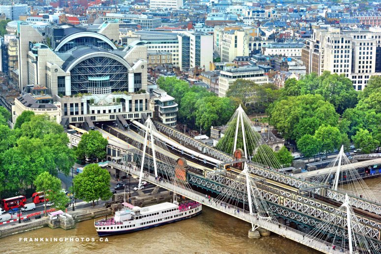 It was a smoggy day when my wife and I went on the London Eye, a giant ferris wheel along the banks of the Thames River. This was one of the views we saw and I did a lot of work in Photoshop to bring out the best in this scene. The bridges run into Charing Cross Railway Station, which was featured in the James Bond movie Skyfall.