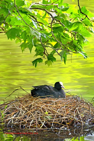 Wonderful photo, Frank, and always a treat to see a coot on the nest. I like how the hanging leaves of bright green parallel with the nesting material of brown sticks.