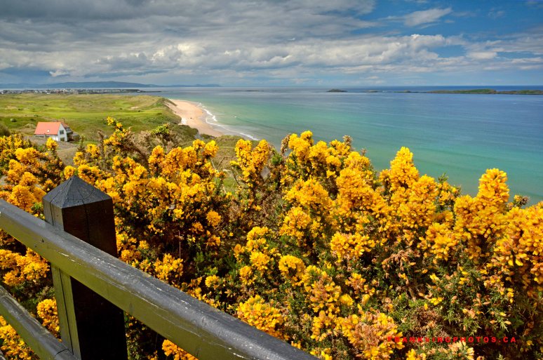I had such a short window to make pictures after our tour bus stopped for lunch that I had no time to get the tripod out of the bus and concentrate on making the best possible composition. So I handheld the Nikon D7100, plus a graduated density (darkening) filter on the sky and came away with this picture. I’m pretty darn pleased. 🙂 In the distance is Portrush Golf Club. Gorse is the yellow bush in the foreground.