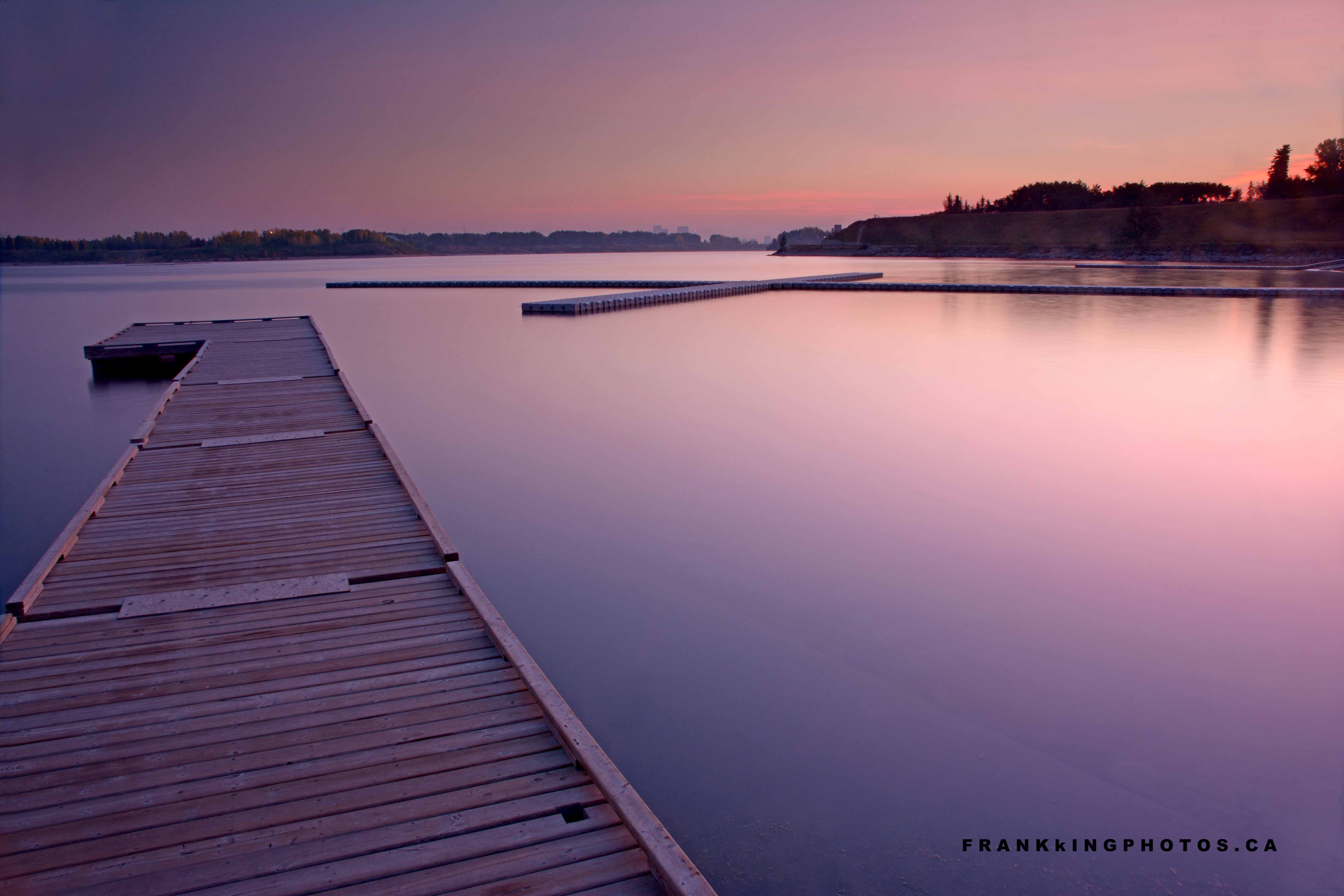 As the dawn slowly approached, I knew I had the makings of a compelling photo here at Glenmore Reservoir, which is the largest water source for the western Canadian city of Calgary. I carefully positioned the tripod to put the wharfs at good relationship to each other and a looooong exposure smoothed out the rippling waters.