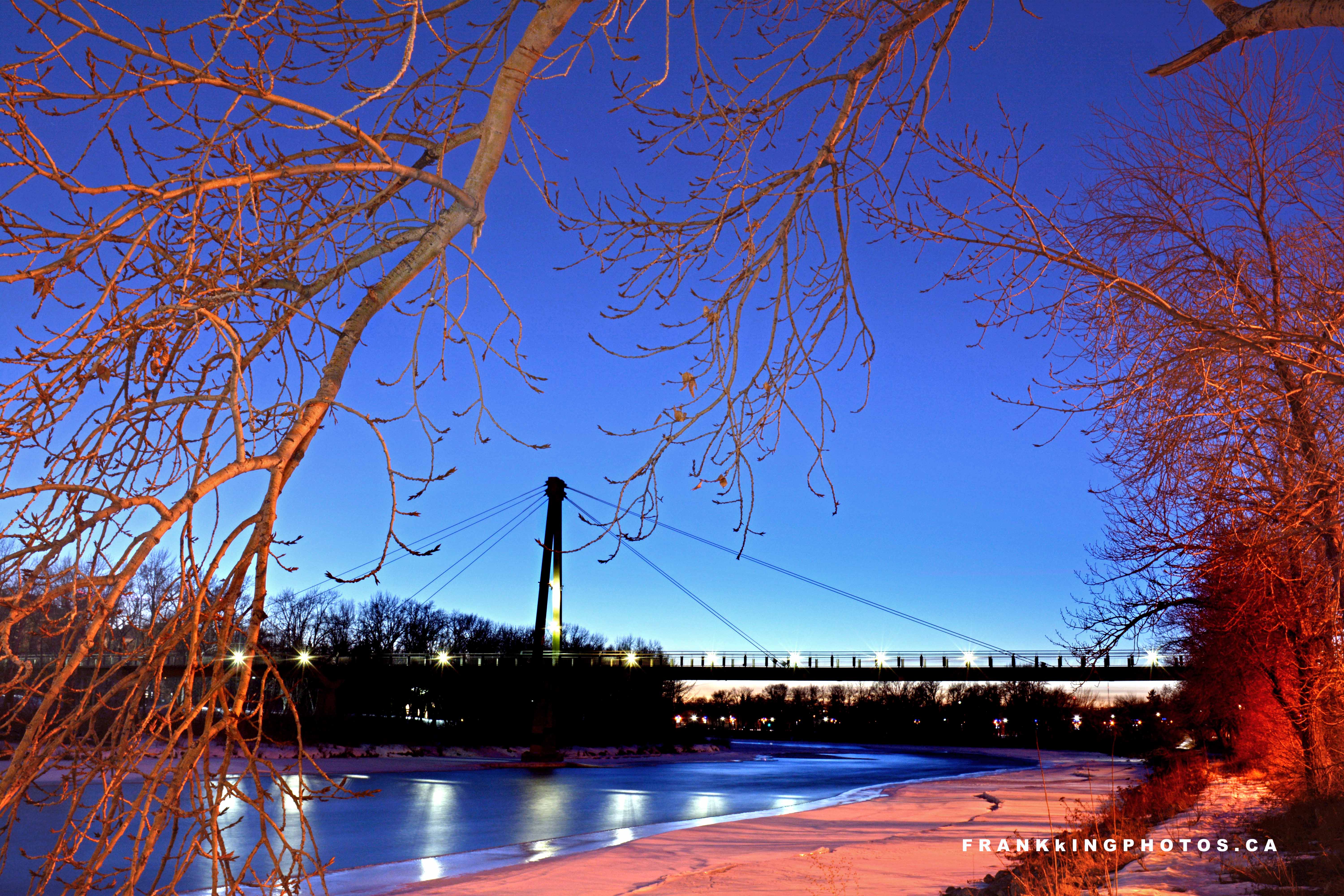 I found a good viewpoint to make a long exposure photo of the last light of sunset and this pedestrian bridge. It connects Memorial Drive and Prince’s Island in the downtown core of this western Canadian city. Memorial Drive streetlights provided the illumination on the snow and tree branches.