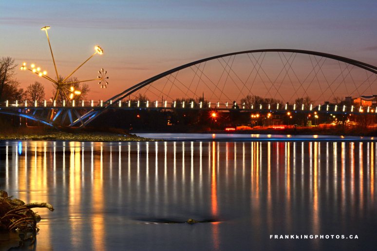 This pedestrian bridge, just east of Calgary’s downtown, is beautifully lit and a source of many interesting photos. This pre-dawn view required a very long exposure, which was ideal to smooth out the water and highlight the reflections. The giant art installation on the left side of the bridge is called “Bloom”.