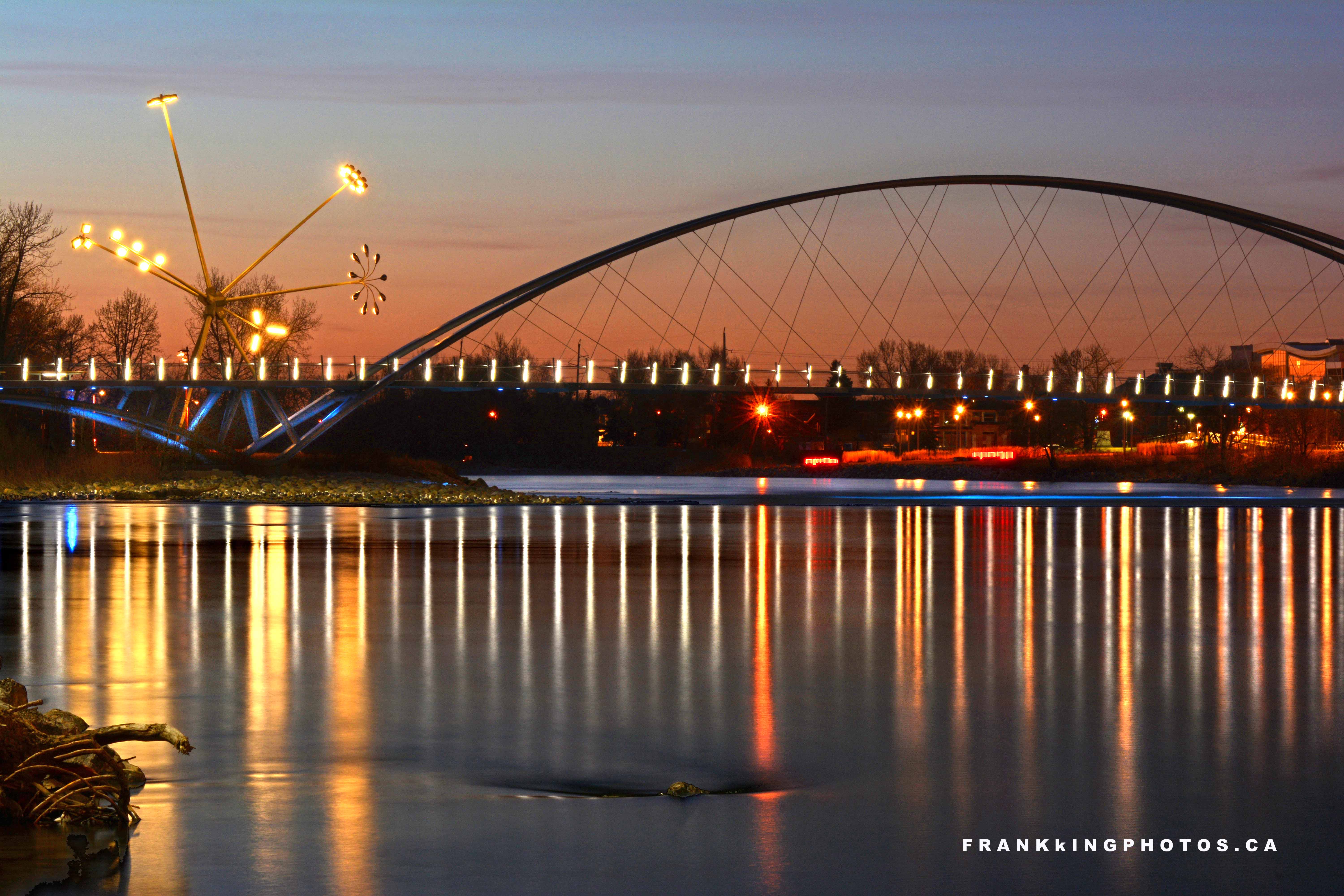 This pedestrian bridge, just east of Calgary’s downtown, is beautifully lit and a source of many interesting photos. This pre-dawn view required a very long exposure, which was ideal to smooth out the water and highlight the reflections. The giant art installation on the left side of the bridge is called “Bloom”.