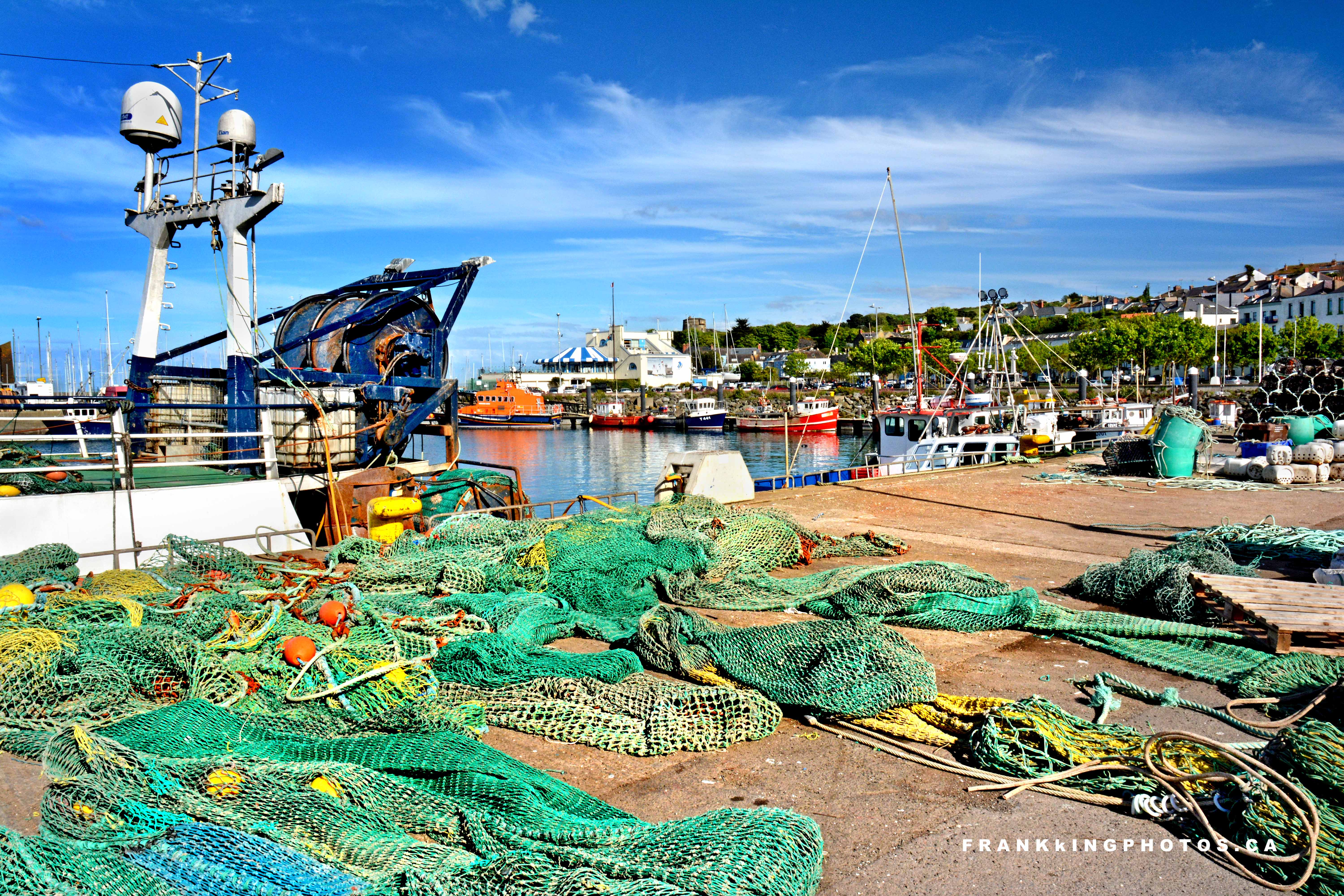 During our European cruise vacation, my wife and I did an excursion out of Dublin. We had a brief stop in the charming town of Howth, which is a Dublin suburb but also a working fishing village. I was intrigued by all the drying nets and the view of the distant shore, so I moved around until finding this composition.