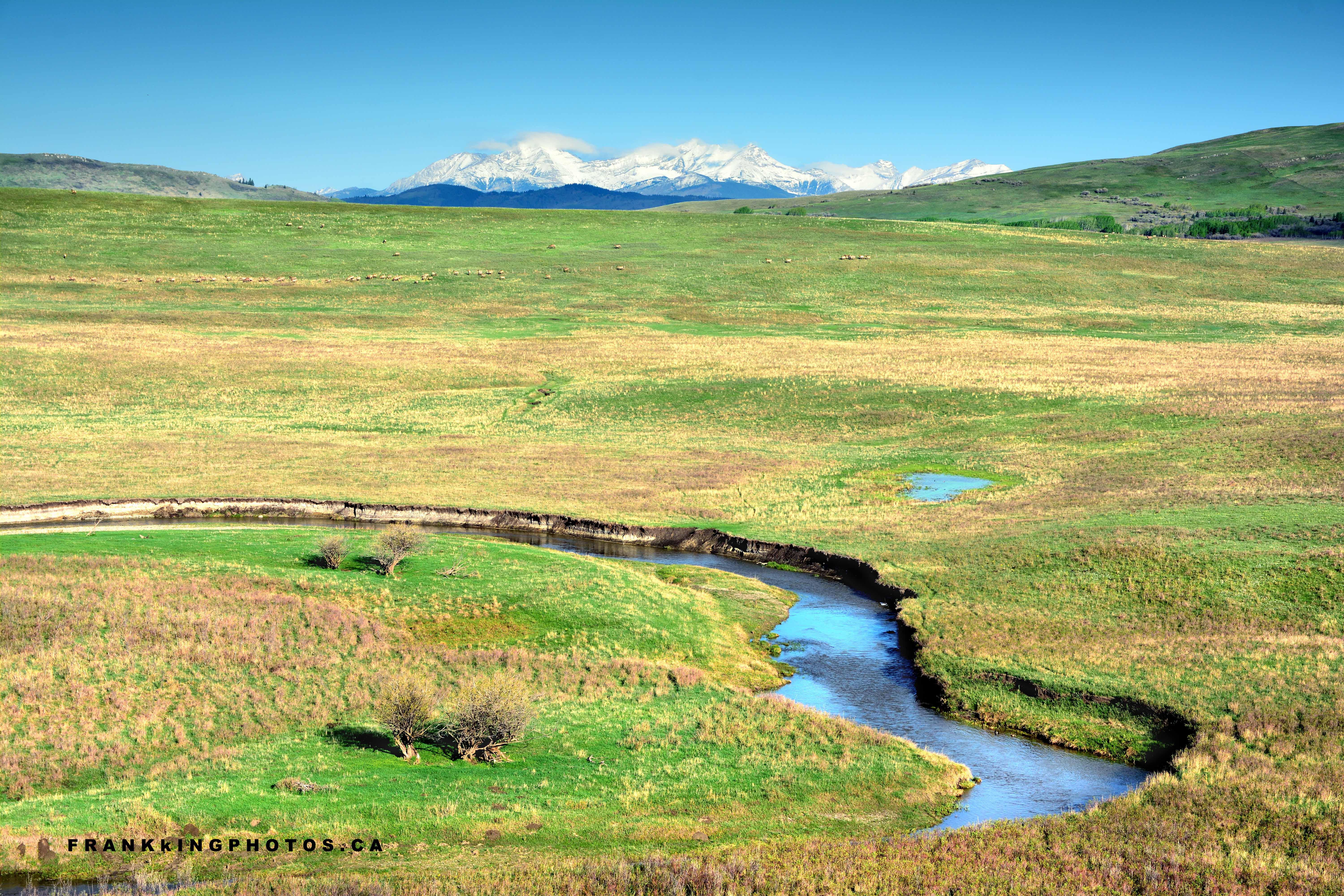 I stopped to photograph the awesome scenery along the Cowboy Trail south of Longview. Only after setting up all my equipment and filters did I look through the lens and notice dozens of elk roaming along the top of the ridge. As if this scene needed anything else to make it special! 🙂