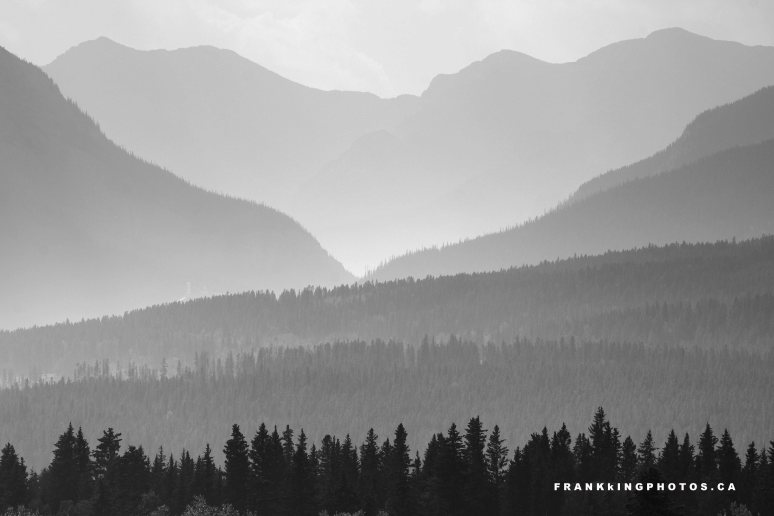 The summer of 2018 has been very bad for forest fires in the Canadian province of British Columbia. Smoke from more than 300 fires has often drifted east into Alberta and made normally blues skies murky and dull. I made the best of this situation, finding a good viewpoint to photograph seven layers (count ’em!) of sky, mountain and forest.