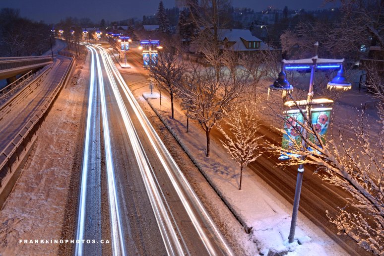 This western Canadian city received almost a foot of snow on a Friday, which means I could get up early on Saturday and find compelling ways to photograph it. This vantage point is a pedestrian bridge over Memorial Drive, named in honour of Canada’s war dead. A long exposure ensured you don’t see any vehicles, just their long lines of light as they travelled the road before dawn.