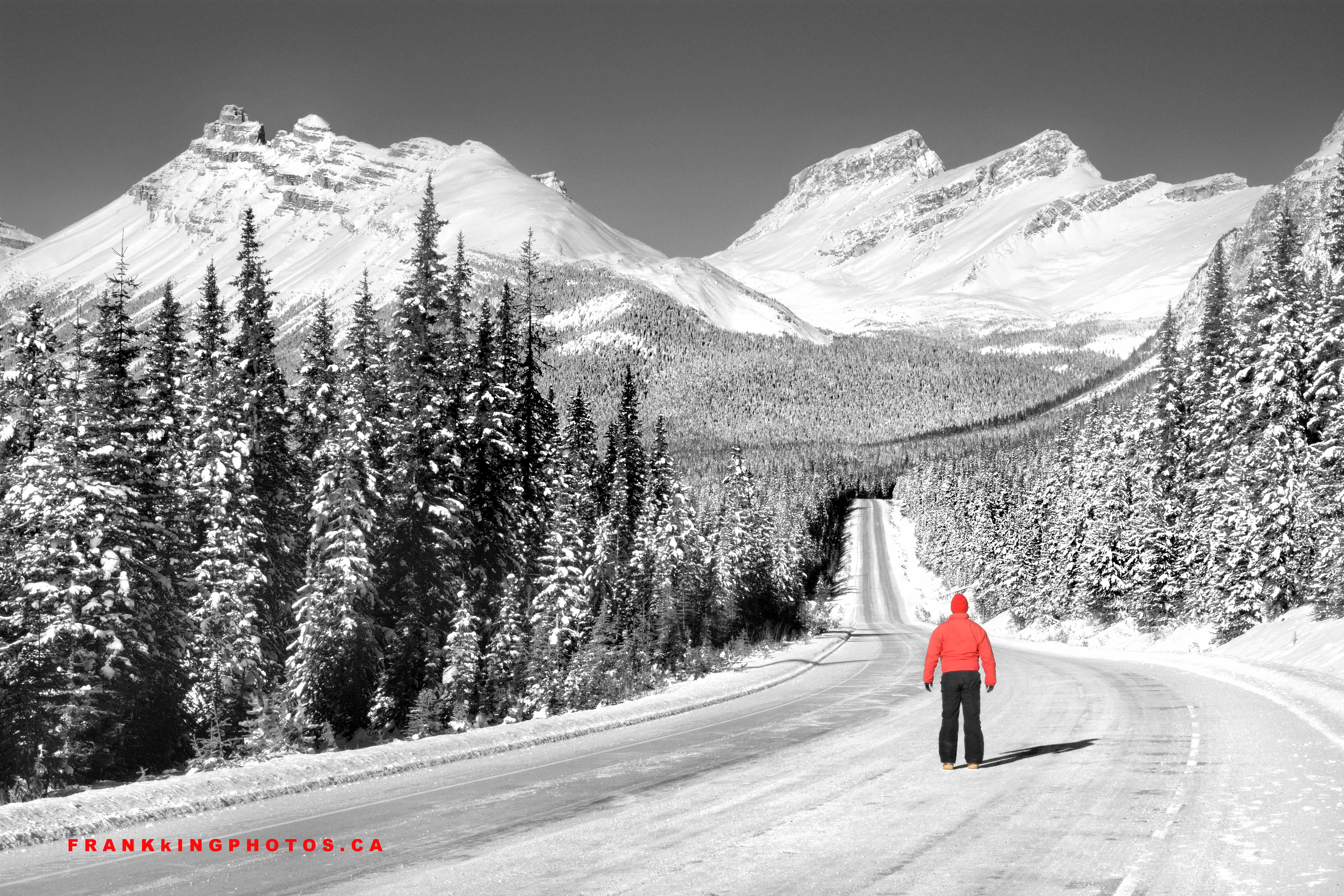 Every time I’ve driven this magnificent road in the Canadian Rockies and come around a corner to see this view, I’ve been stunned into silence and prayer. One morning I decided to put me into the scene then, during processing, turn everything but me into black-and-white. Kinda cool, eh? 🙂