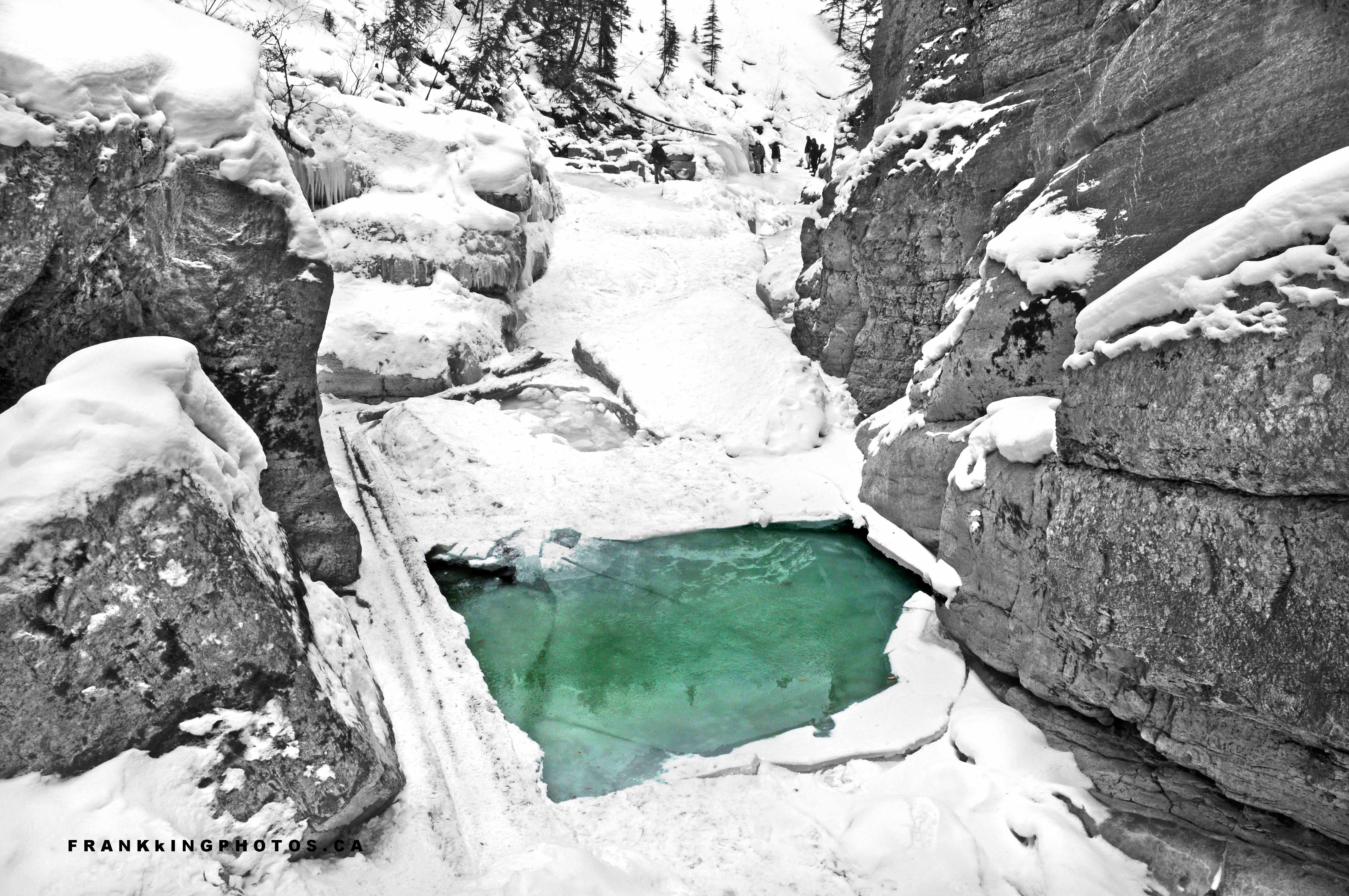 When this glorious Canadian Rocky Mountain canyon freezes over, tour companies take people on guided tours to experience it from the bottom. It’s a fascinating experience and I was blessed to find this viewpoint highlighting an unfrozen pool. Because it had almost all the colour in this mostly monotone scene, I kept it in colour and turned the rest of the photo into black-and-white. The distant tourists provide scale to show you the size of this wonderful place. Here’s what the canyon looks like in summer: https://wp.me/p2ccTX-xL.