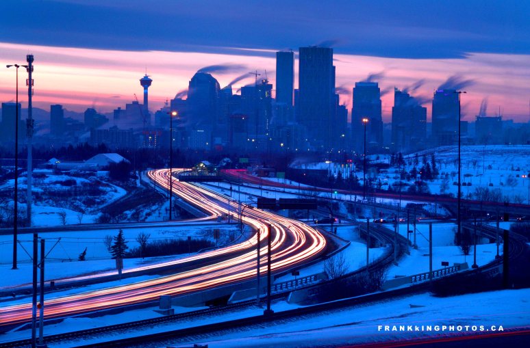 This is a “busy” scene, with light, cellphone and light rapid transit poles scattered everywhere. But I knew with a good sunset and lots of drive-home commuters, I could still make a compelling photo. See the smoke coming off all the skyscrapers? Most of that is steam created by the bitter prairie temperature. Here’s another c-c-cold Calgary skyline view, taken from a great viewpoint just north of downtown: https://wp.me/p2ccTX-12o