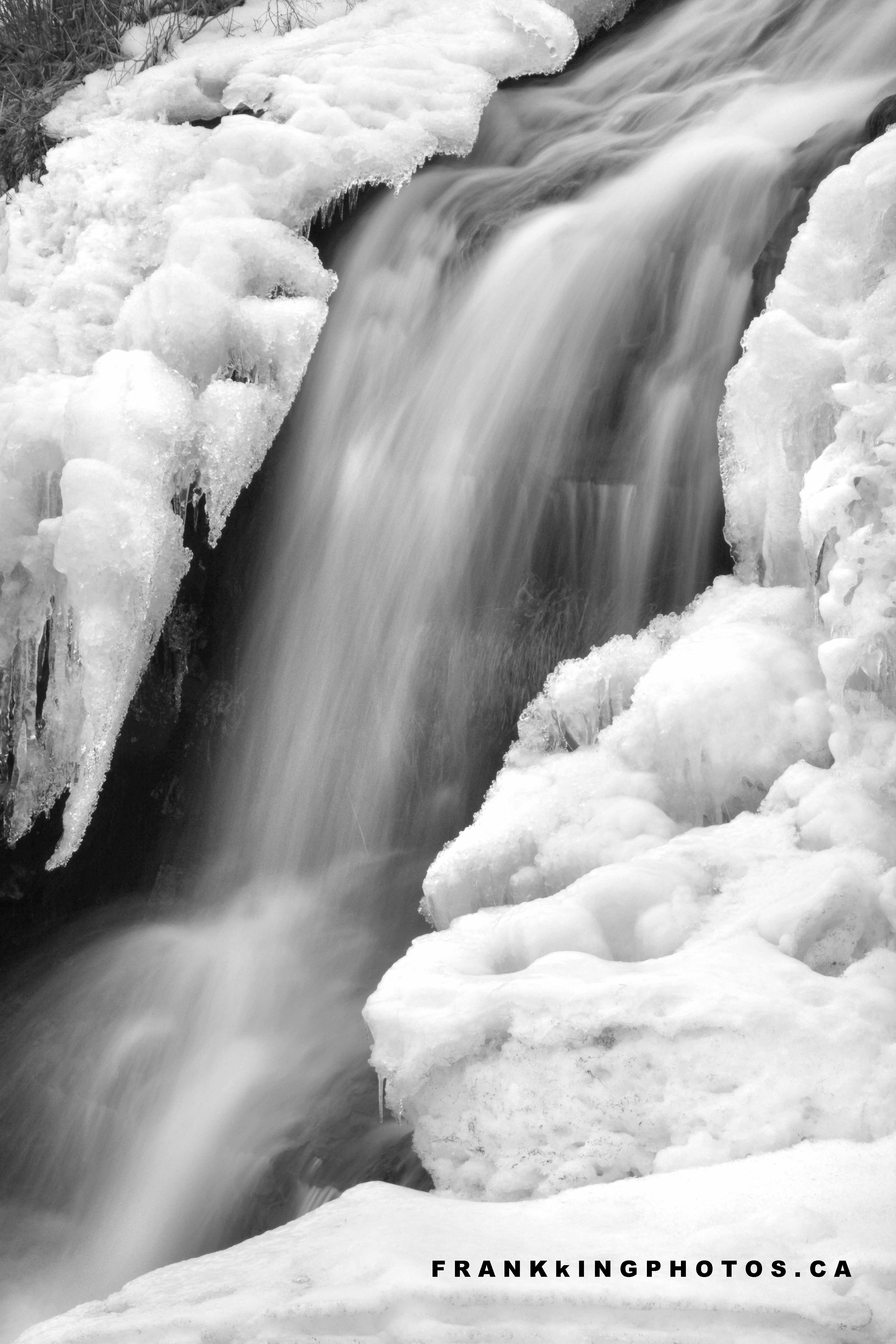 I was traveling to a work meeting when I encountered this beautiful little waterfall, surrounded by icy snow, on a hillside beside the road.