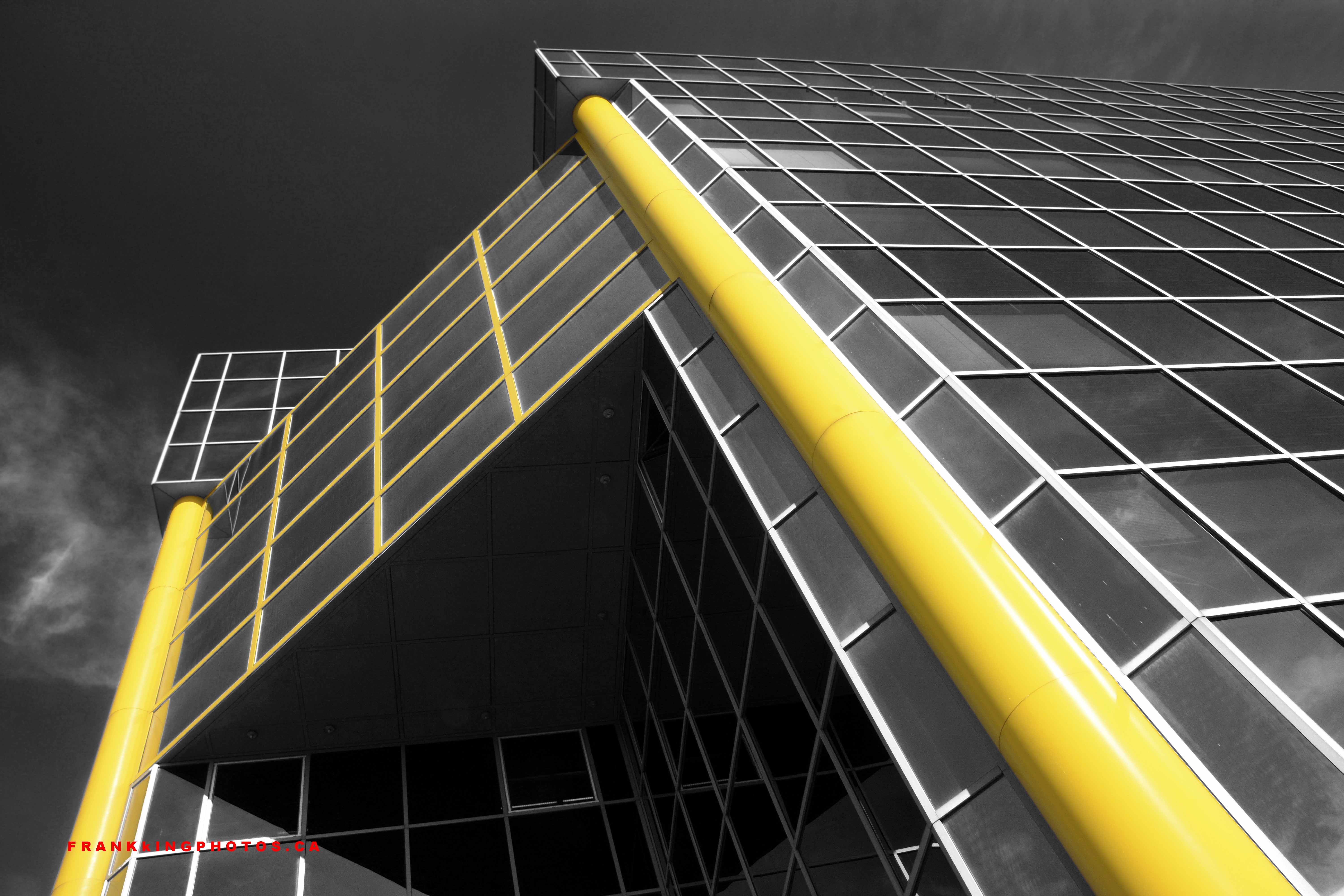 I passed this building often when visiting Toronto and always wanted to see if those yellow posts could translate into a compelling photo. Finally, I spent an hour there one afternoon trying all kinds of compositions. This is one of the best and I decided to highlight the yellow by turning the rest of the photo into black-and-white. Here’s the full colour version: http://bit.ly/TorontoBuilding.