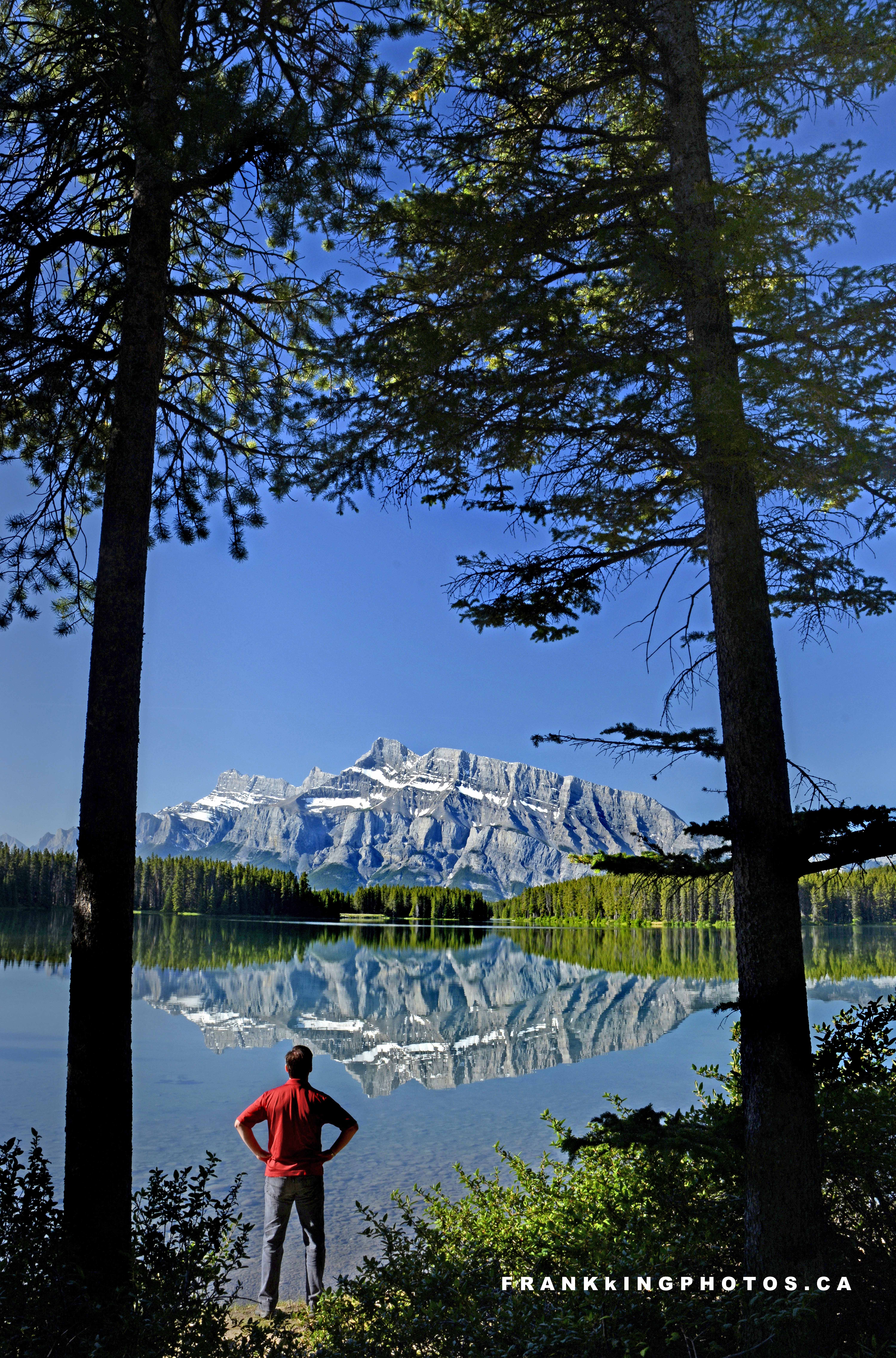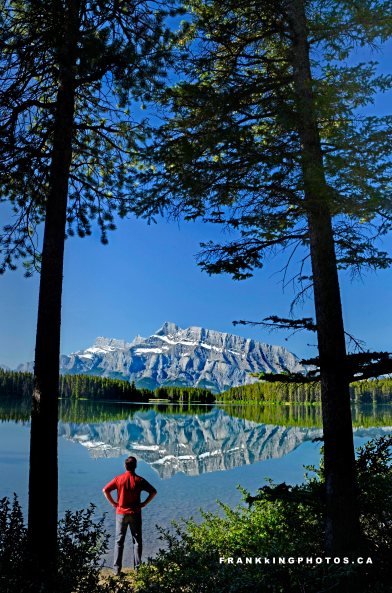 It was, as you can see, a glorious morning in the Canadian Rocky Mountains and I loved this view framed by the trees. I have what I think is a compelling picture without any human presence, but tried this one (with me) and find it even better. What do you think – would this photo be better without a person in it?