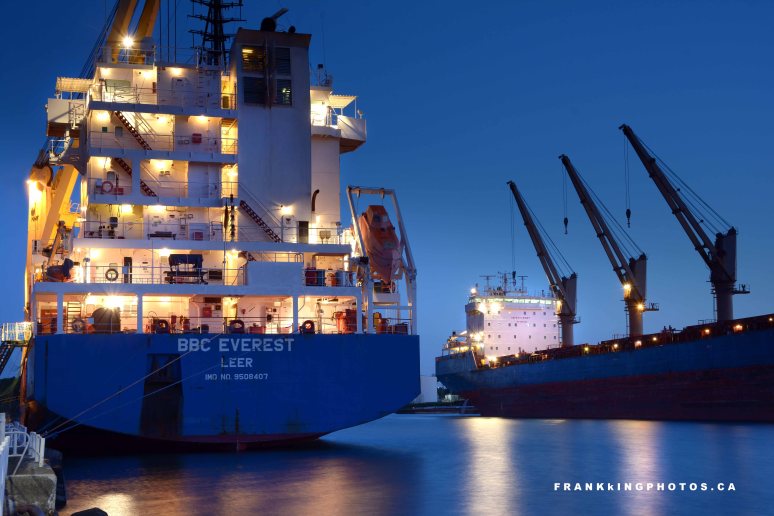 This working port, just east of Toronto (Canada’s largest city) has produced many satisfying photos, but this one is sort-of a repeat. I visited here before dawn a few years earlier and photographed a nicely lit ship – but my camera settings were all wrong. Another attempt to get it right turned out better, because this time there were TWO ships in port and my camera settings were correct.