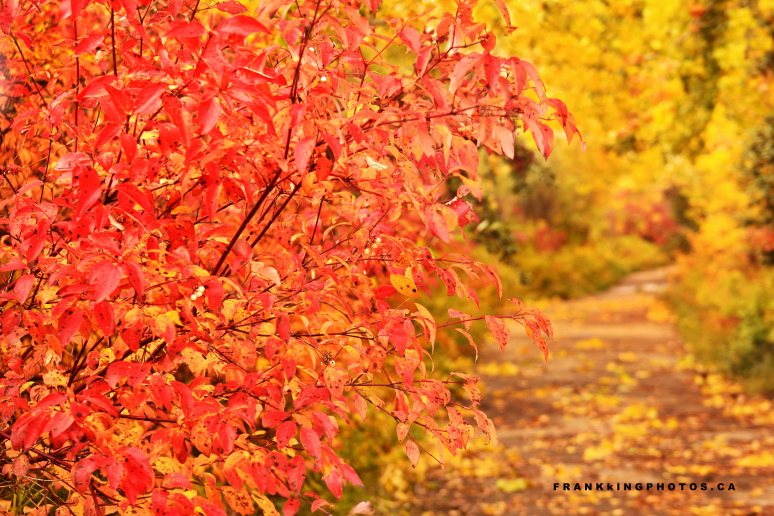I visited this wonderful Canadian badlands photography mecca at the height of autumn, spending an entire day finding very compelling scenes almost everywhere I looked. Encountering this glowing red bush, I decided to go with a very shallow depth of field so your eyes can enjoy the foliage, then wander along the pathway under a canopy of brilliant yellow.