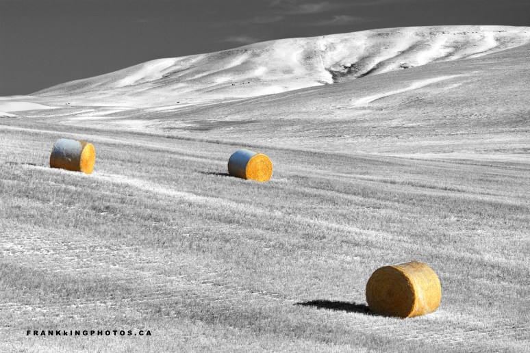 I like the full-colour version (you can see it here: http://bit.ly/AlbertaHayRolls), but with just these three rolls in a giant field, I could see a compelling picture with just them in colour. What do you think?