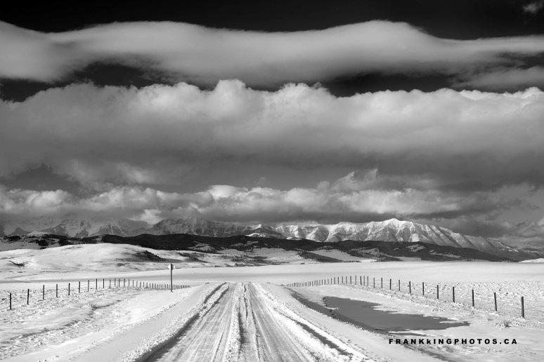 I’m in a black-and-white mood these days and, given the relative lack of colour in this scene — just blue, really — it was a no-brainer to show you the monotone photo (see the full-colour version here: http://bit.ly/AlbertaWinterRoad). BTW, that’s the Canadian Rockies on the horizon.