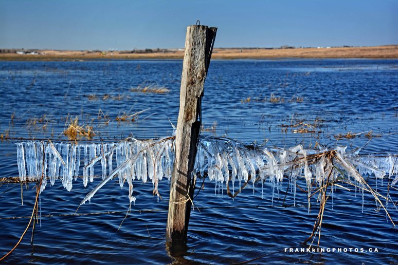 Spring is a ficklesome thing on the Canadian prairies; one day it’s warm and the next cold & snowy. I was cruising the gorgeous landscapes near my home in Calgary when I encountered this drowned fence, complete with icy tentacles.