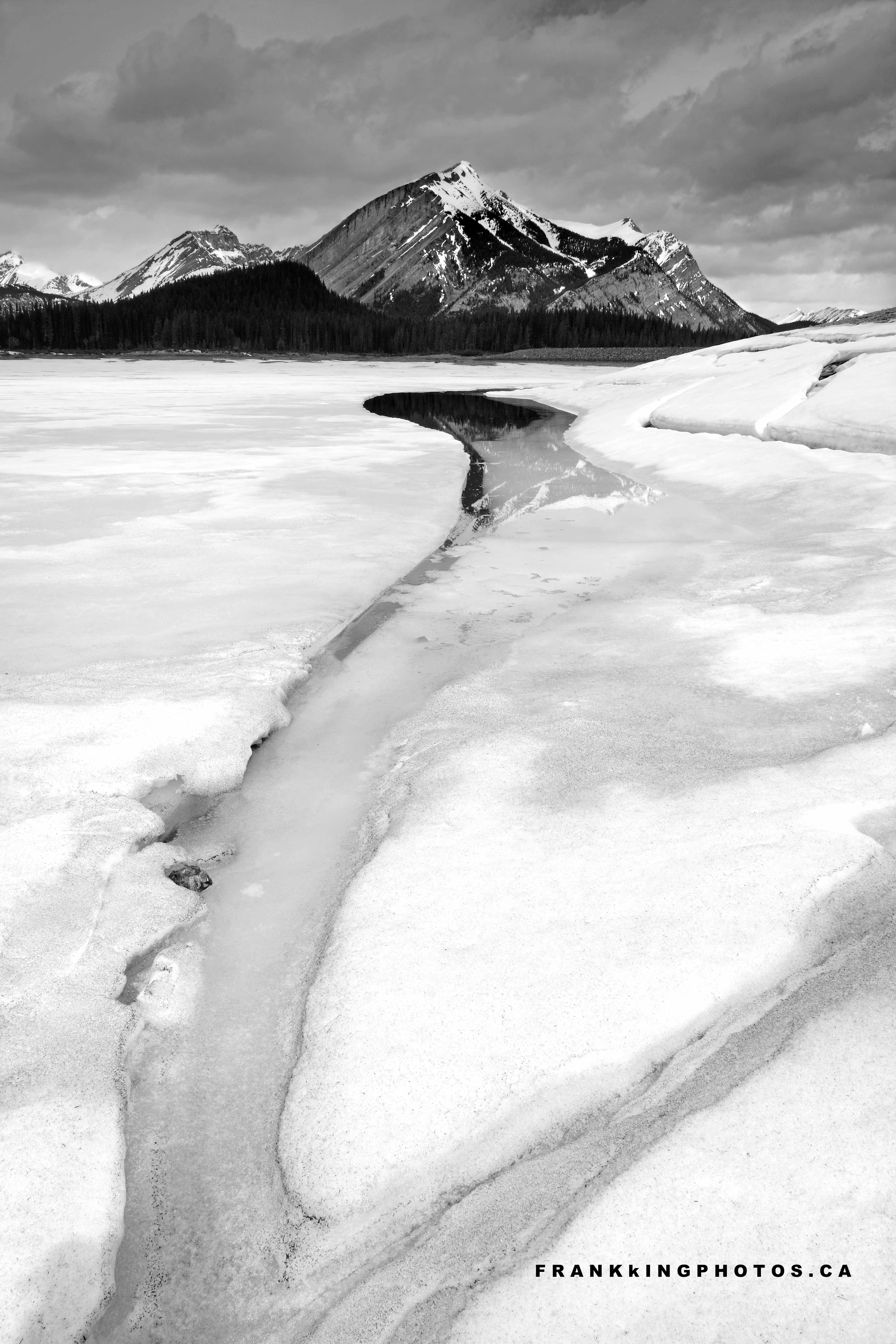 I saw this meltwater pool from far off and delicately approached it, hoping the I wouldn’t sink up to my knees in the wet, icy snow. Thankfully, it was hard-packed all the way. There was very little colour in this scene, so I dispensed with it altogether.