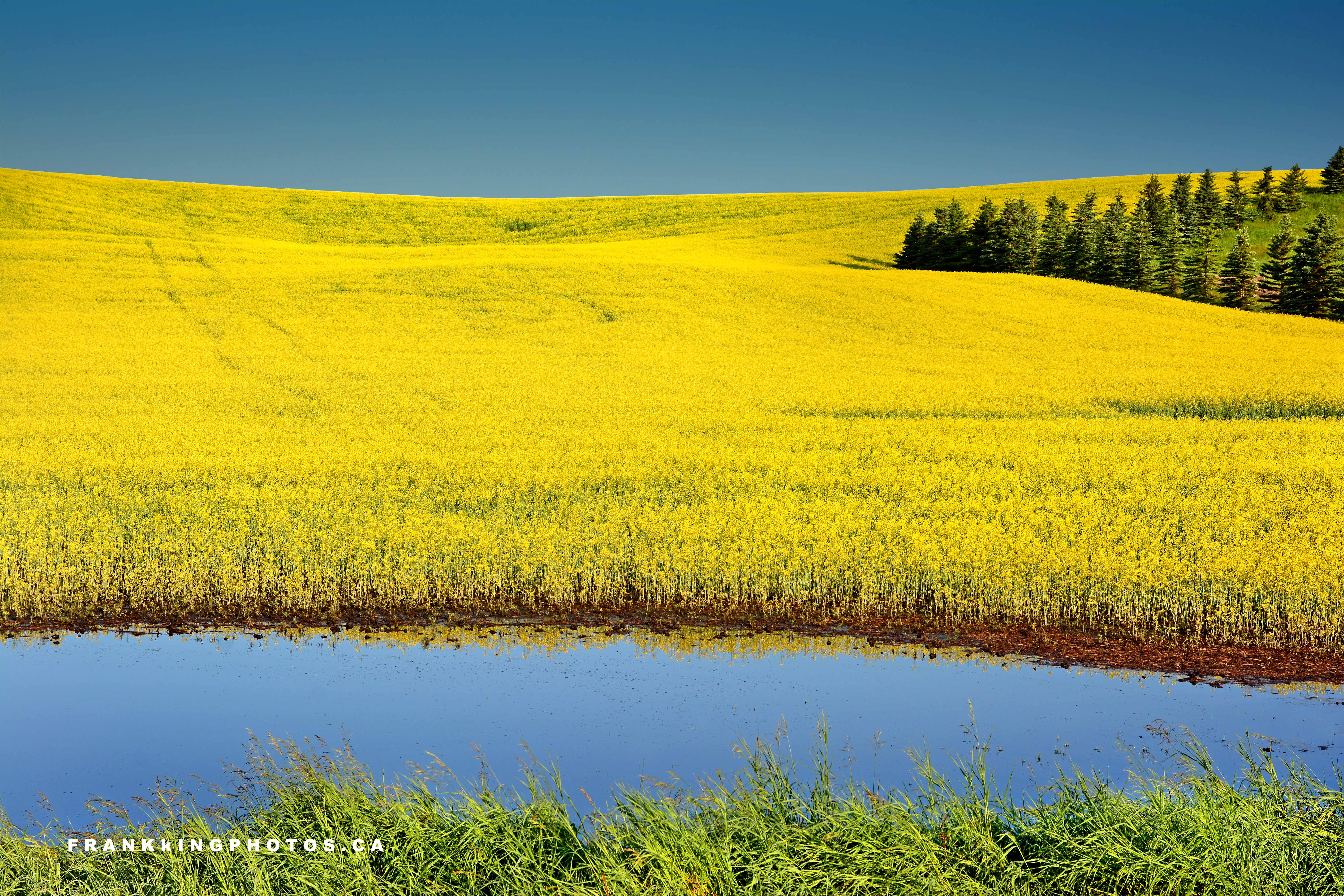 July is canola season, when random fields in this western Canadian province glow with flourescent, in-your face atomic yellow. It’s a great time to just cruise country roads looking for these fields. This example was particularly compelling because the prairie slough added a great visual element.