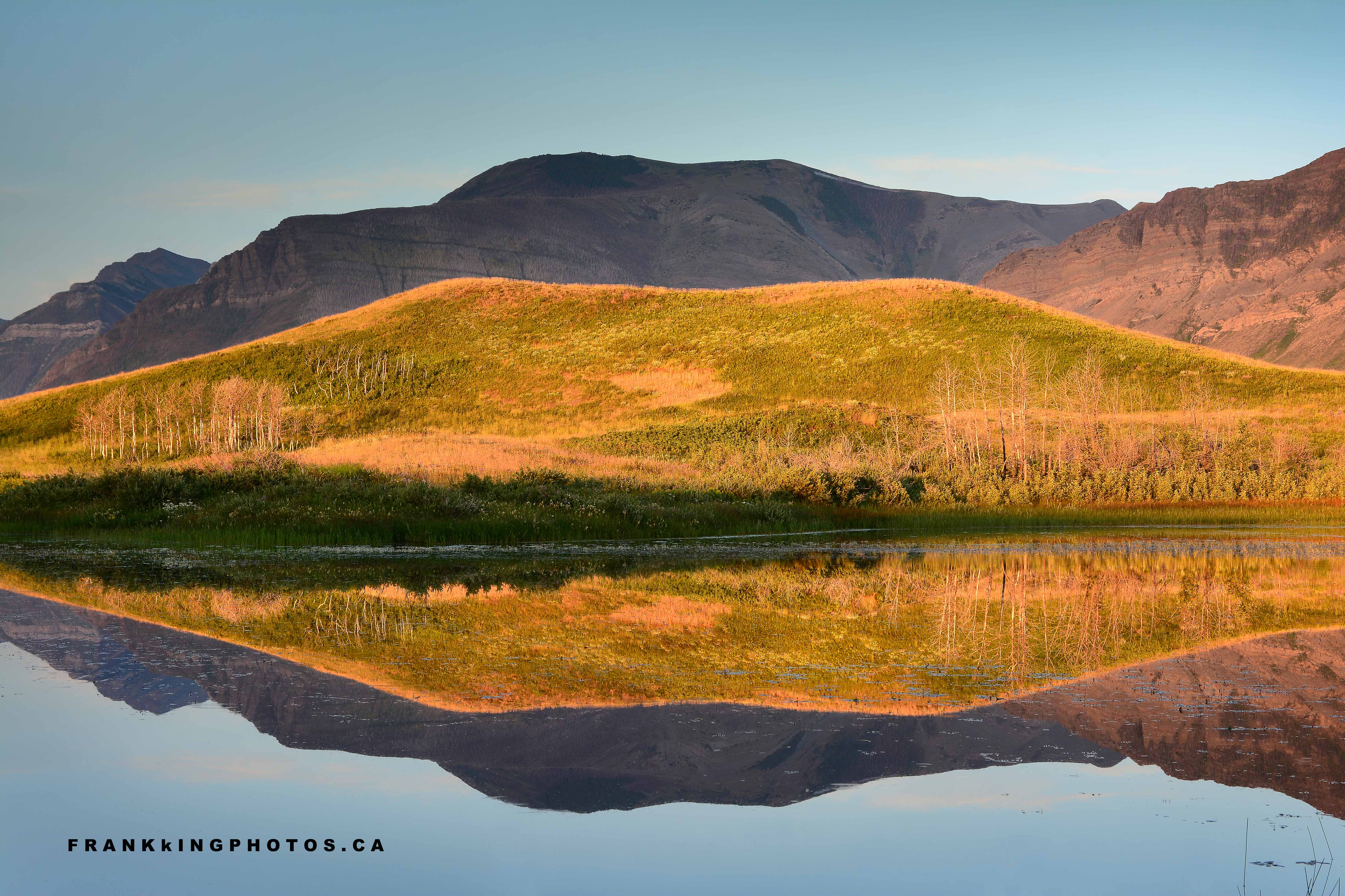 This pond was beside the road I was traveling and I stopped to investigate creative possibilities. As you can see, those possibilities were downright breathtaking. I actually photographed this scene twice, coming back a second time as the first light of day strengthened and increased the contrast and colour. There was just enough clouds to block the sun from hitting the peak behind the ridge, a key requirement to make this scene truly compelling.