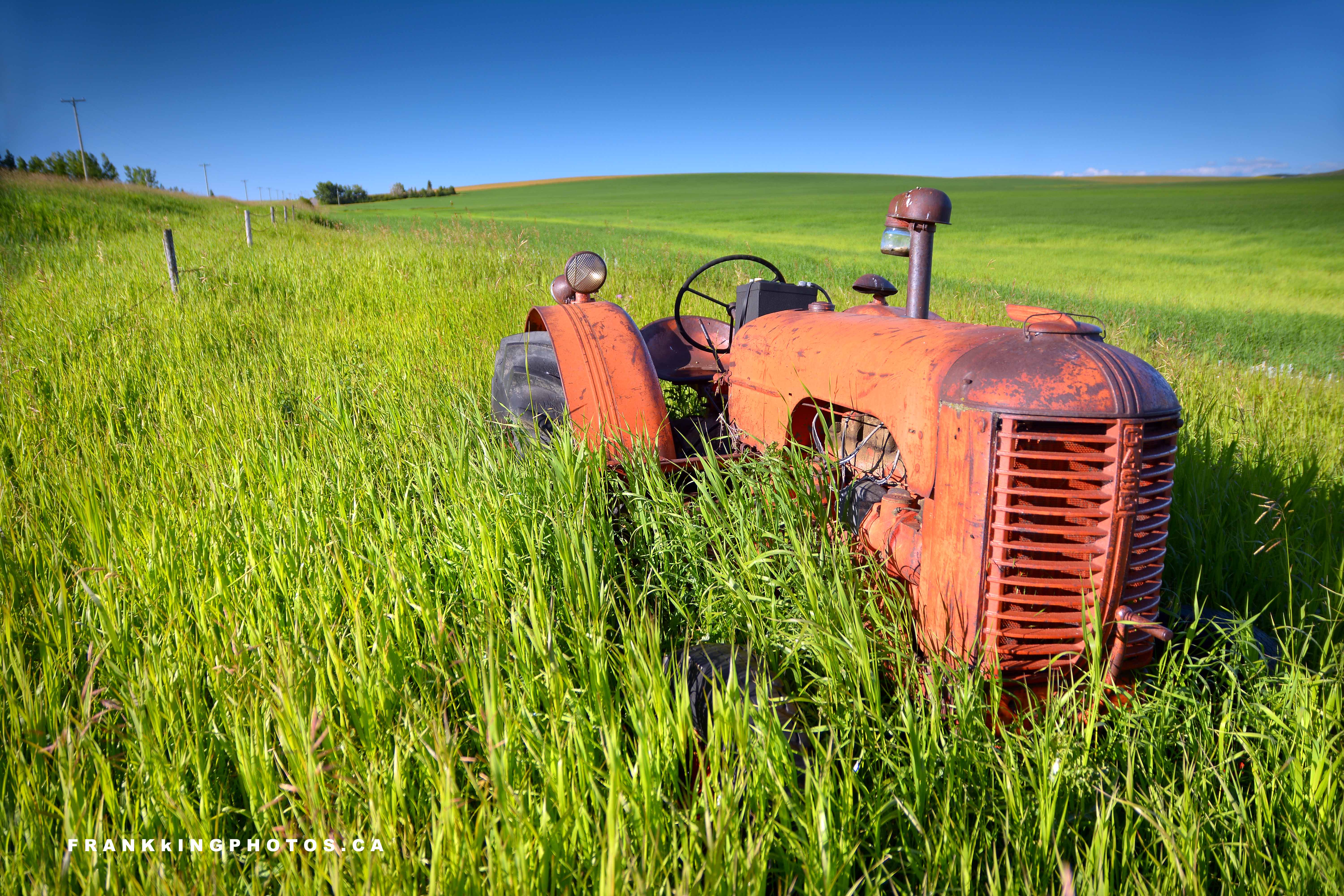I’m a sucker for old buildings and vehicles, so when I spotted this antique beauty in a glowing field of morning green, I stopped the car and spent the next half-hour finding various compositions of tractor, prairie field and sky. This is one of them.
