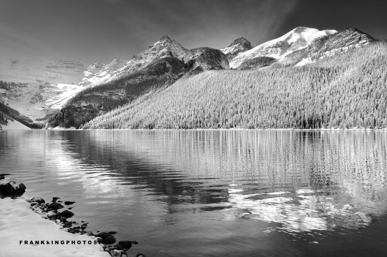 I’ve rarely been able to visit this iconic Canadian Rocky Mountain lake with snow and before the water freezes for six months. So this was a bonus; I was there to go for a walk with my lovely wife and this was the only composition I photographed – so a 100 percent success rate on this “photo” trip! 😉