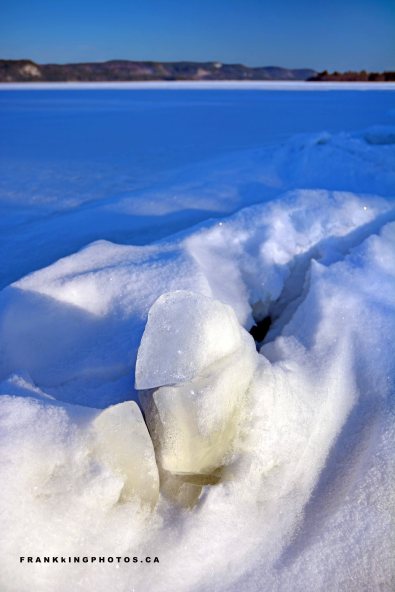 Using a very shallow depth of field put the distant shoreline out of focus so it wouldn’t compete with the ice formation, yet still enable you to comprehend what you’re seeing.