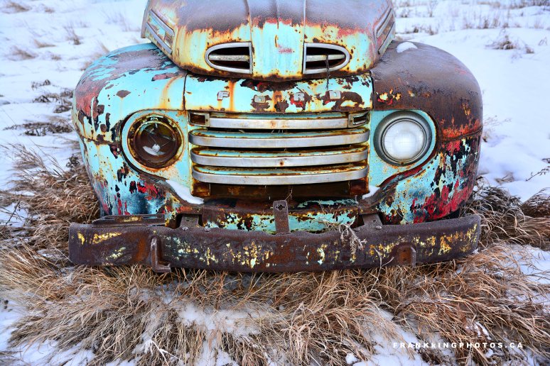 This colourful beauty is near one of the main highways into this town. The back end has a huge sign promoting downtown art galleries. I was careful to keep that — and nearby chain-link fencing — out of all compositions so you could concentrate on the artistry of the front end, the remarkable hues and the delicate prairie grass.