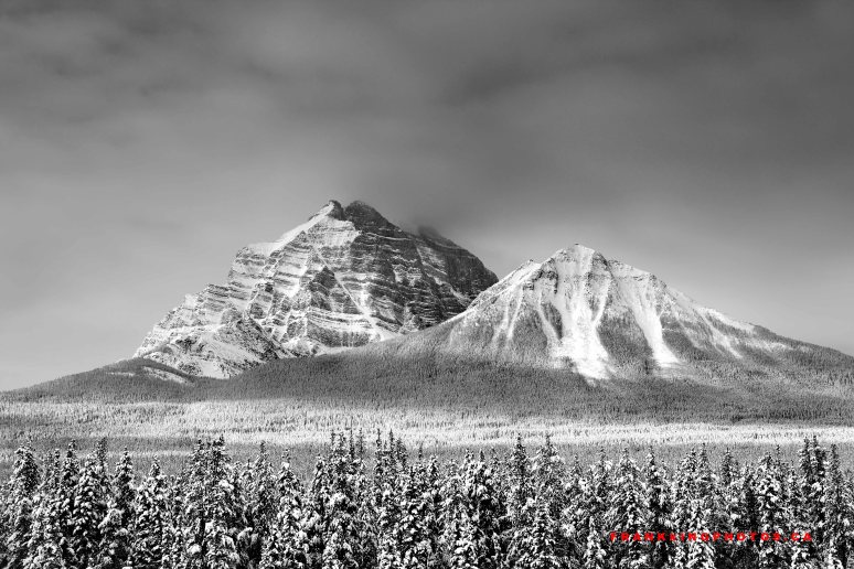 While photographing at this famous spot in the Canadian Rockies (here’s a view: https://wp.me/p2ccTX-tH), I loved the clean, simple view of Mount Temple, one of the best know peaks in the park. So I made several exposures and really liked this one because there’s lots of space around the peaks, making the composition almost minimalist.