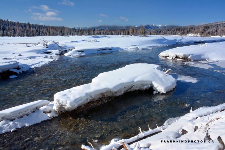 Notice the distant forests? That’s a new layer of snow on them which adds a welcome light touch to the background of this snow-and-water composition.