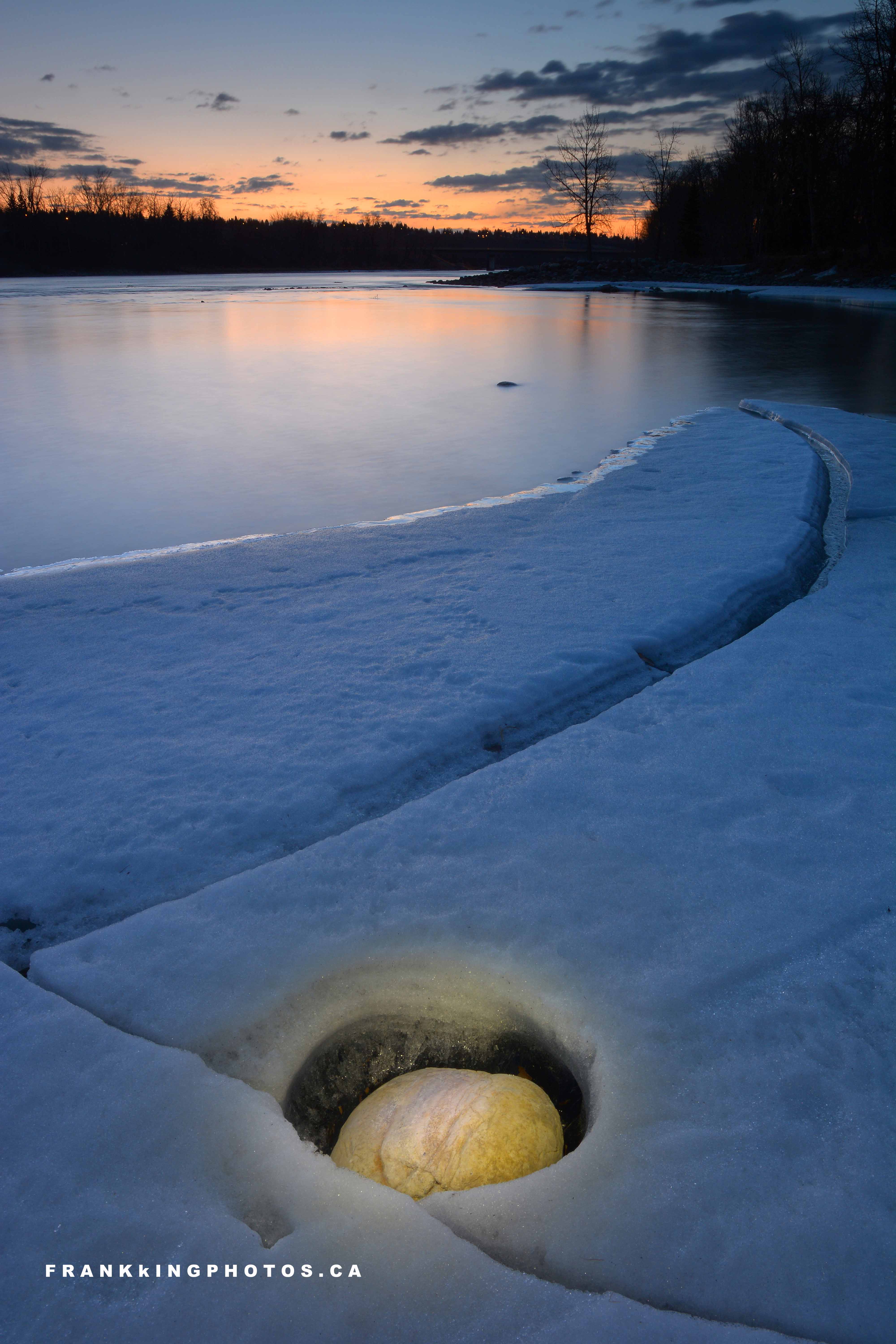 I was wandering along the shore of the Bow River, which flows through this western Canadian city, looking for interesting spring ice formations, when I came upon this opening around a small boulder.