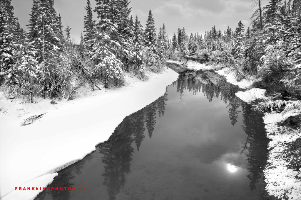 A day earlier we were wearing T-shirts and roasting marshmallows at our backyard fire pit. Now, I was back in full winter garb and excited to capture a spring snowfall. One of the nice things about spring snow in this western Canadian province is many of the ponds and rivers are ice-free and that usually makes for better photos. This is, I hope, a good example of that and I went black-and-white because there was almost no colour in this scene. Nikon D7100, tripod, polarizing filter, graduated density (darkening) filter on the sky
